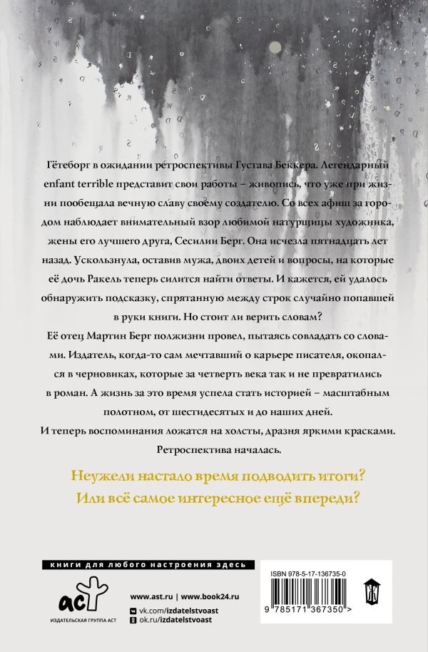 Гётеборг в ожидании ретроспективы Густава Беккера. Легендарный еnfant terrible представит свои работы — живопись, что уже при жизни пообещала вечную славу своему создателю. Со всех афиш за городом наблюдает внимательный взор любимой натурщицы художника, жены его лучшего друга, Сесилии Берг. Она исчезла пятнадцать лет назад. Ускользнула, оставив мужа, двоих детей и вопросы, на которые ее дочь Ракель теперь силится найти ответы. И кажется, ей удалось обнаружить подсказку, спрятанную между строк случайно попавшей в руки книги. Но стоит ли верить словам?