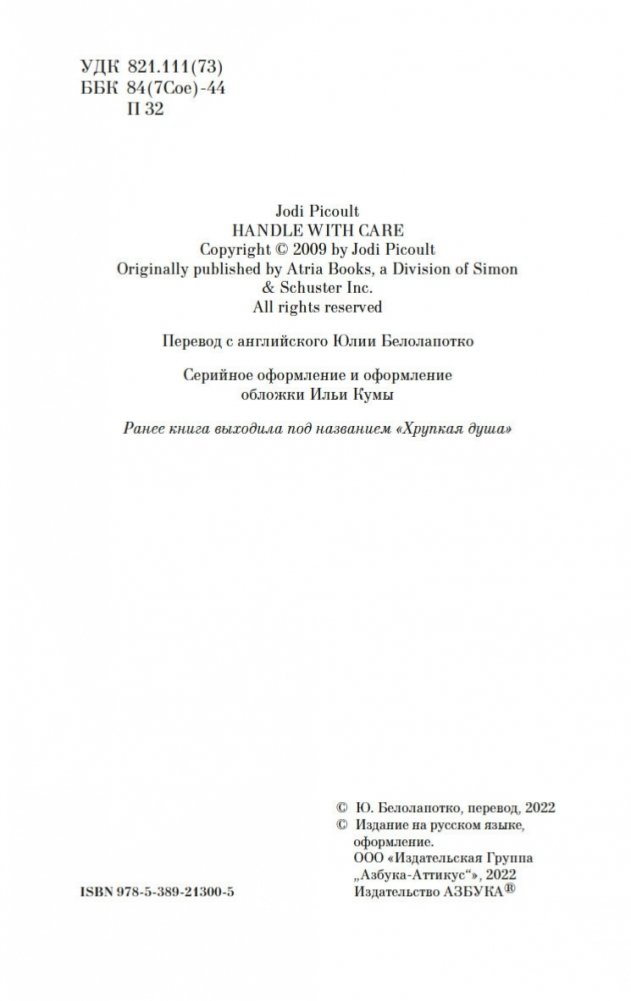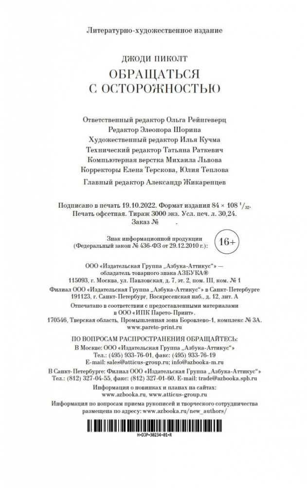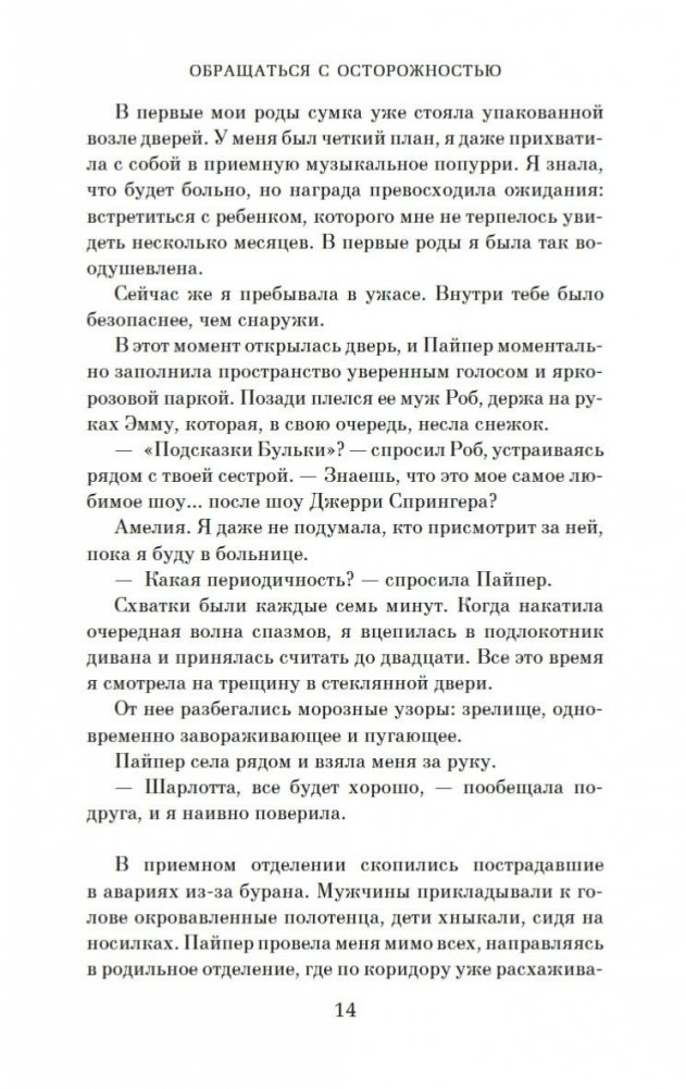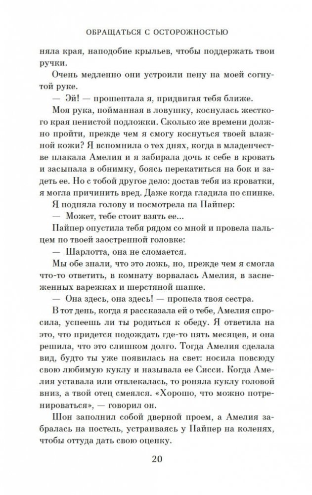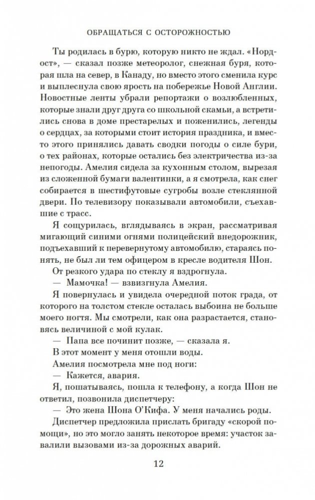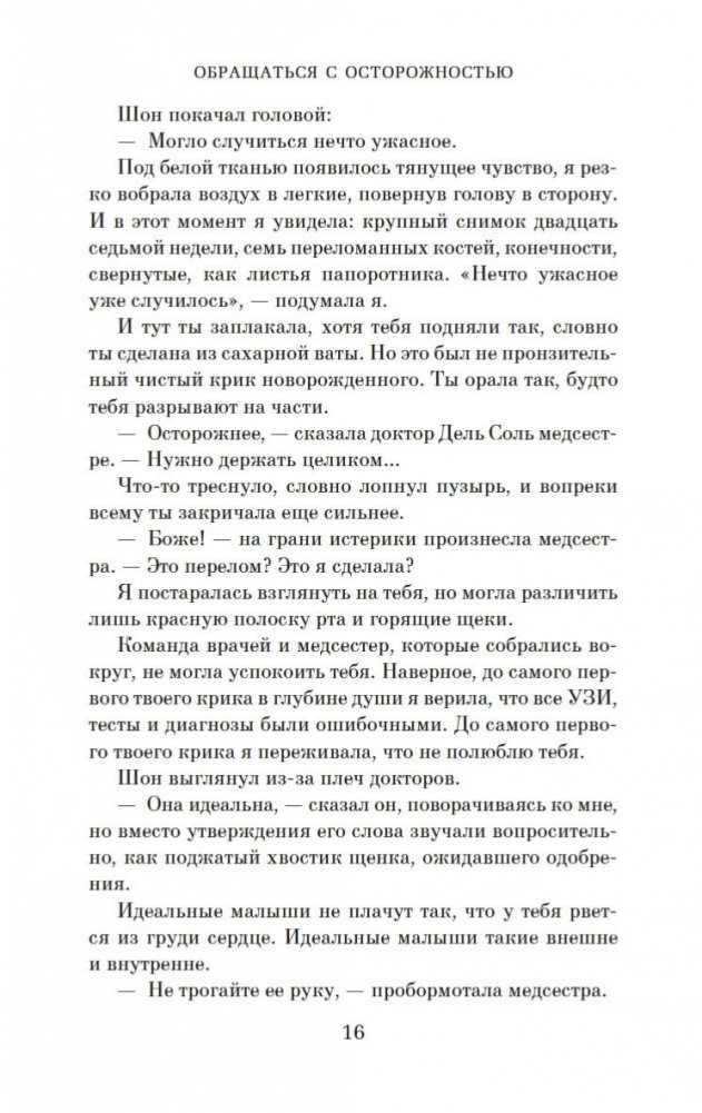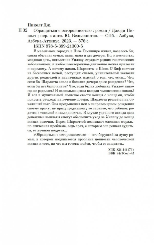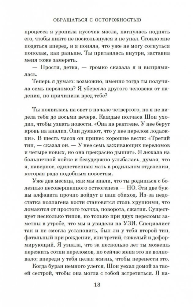 В маленьком городке в Нью-Гэмпшире живет, казалось бы, самая обычная семья: папа, мама и две дочери. Но, к несчастью, младшая дочь, пятилетняя Уиллоу, страдает редким генетическим заболеванием, и любое неосторожное движение может привести к перелому. А потому жизнь Шарлотты и Шона О’Киф состоит из бессонных ночей, растущих счетов, унизительной жалости других родителей и навязчивых мыслей о том, что, если… Что, если бы Шарлотта знала о болезни дочери до ее рождения? Что, если бы все было иначе? Что, если бы их любимая Уиллоу никогда не родилась? И насколько ценна каждая человеческая жизнь? И вот в мучительной попытке свести концы с концами, чтобы покрыть расходы на лечение дочери, Шарлотта решается на отчаянный шаг. Она предъявляет иск о неправомерном рождении своему врачу, не предупредившему ее заранее, что ребенок родится с тяжелой инвалидностью. В случае удачного исхода дела денежные выплаты смогут обеспечить уход за Уиллоу до конца жизни девочки. Перед Шарлоттой возникает сложная морально-этическая проблема, ведь врач, с которым она решает судиться, ее лучшая подруга… «Обращаться с осторожностью» — это берущий за душу роман, в котором поднимается проблема ценности человеческой жизни и того, на что мы готовы пойти, чтобы ее защитить.