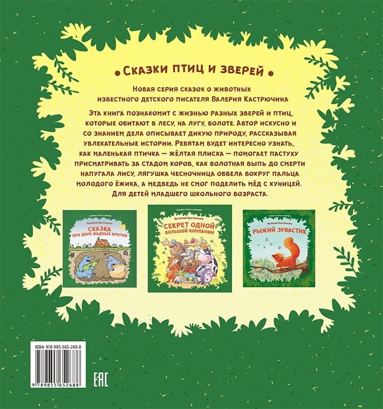 Эта книга познакомит с жизнью разных зверей и птиц, которые обитают в лесу, на лугу, болоте. Автор искусно и со знанием дела описывает дикую природу, рассказывая увлекательные истории. Ребятам будет интересно узнать, как маленькая птичка – жёлтая плиска – помогает пастуху присматривать за стадом коров, как болотная выпь до смерти напугала лису, лягушка чесночница обвела вокруг пальца молодого ёжика, а медведь не смог поделить мёд с куницей.