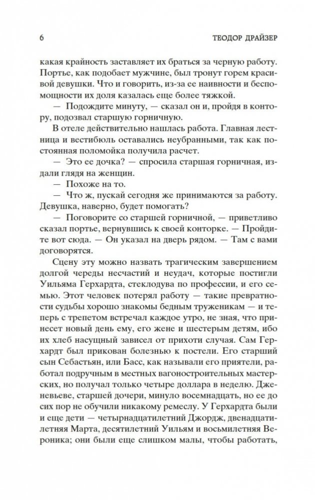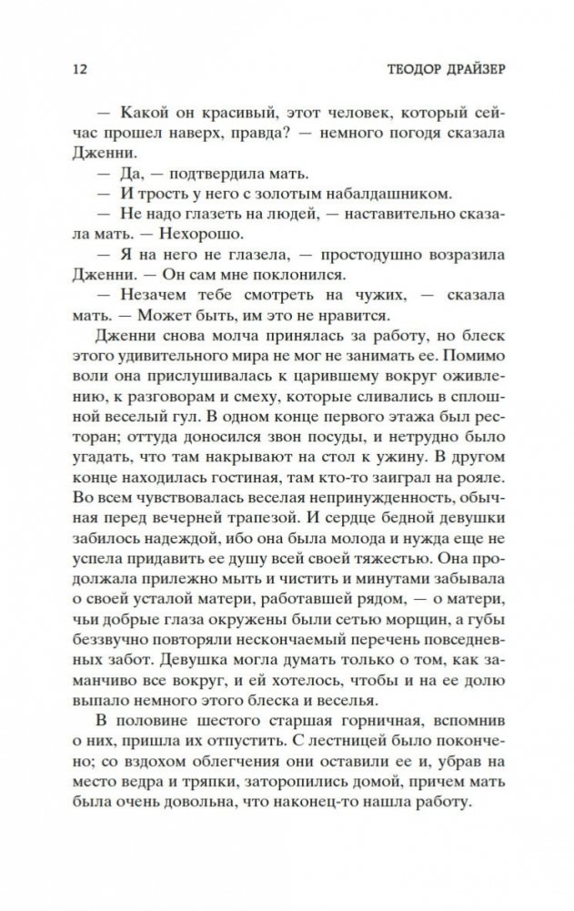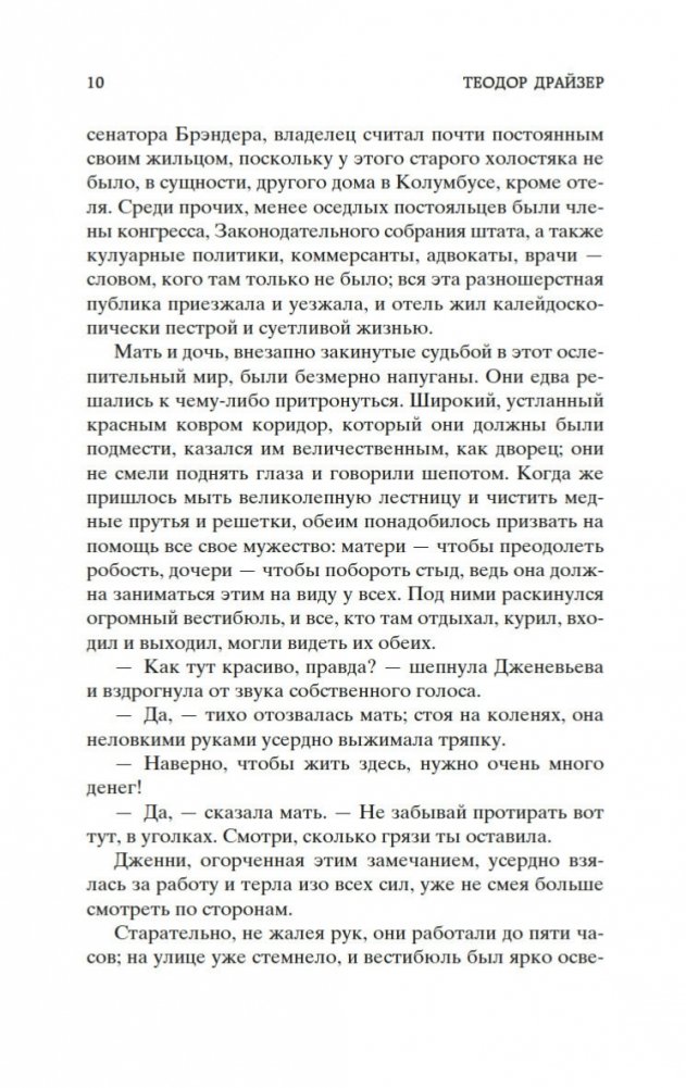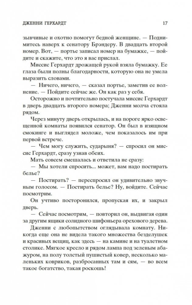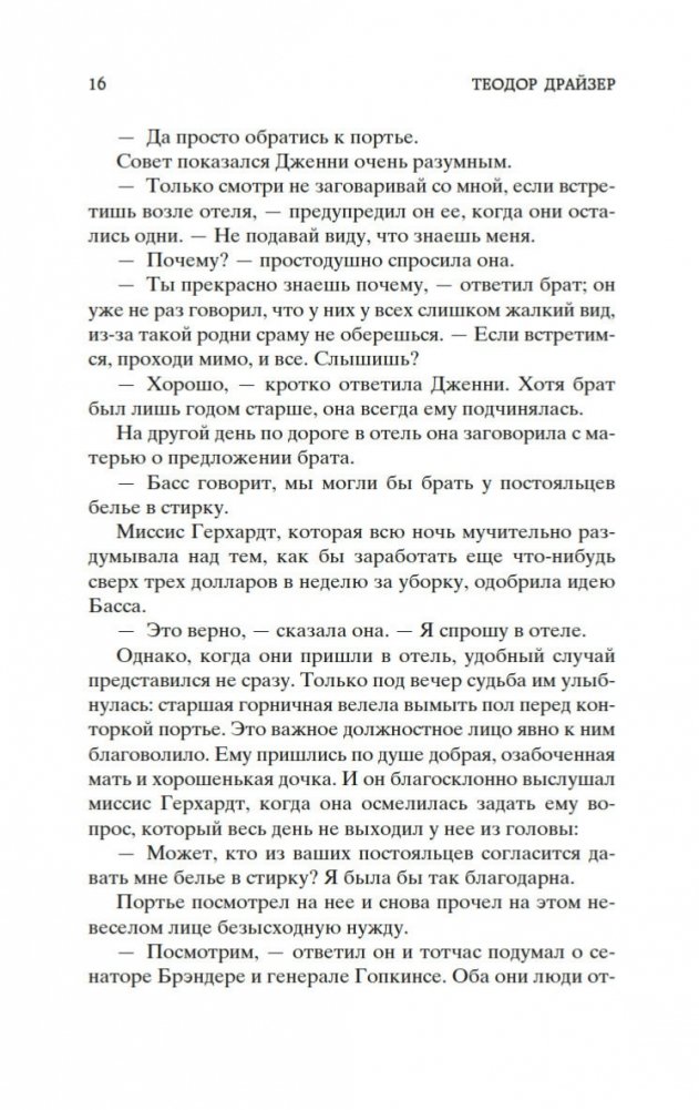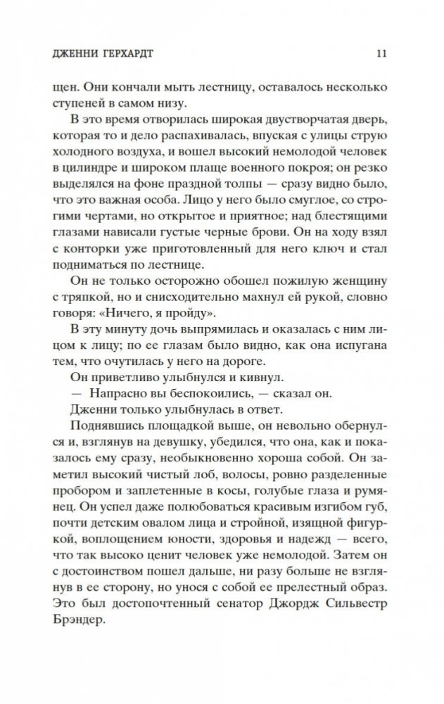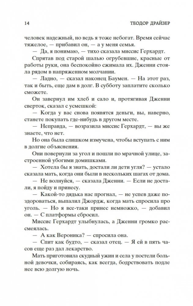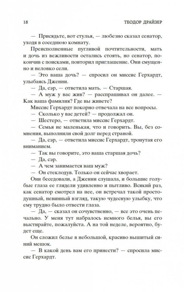 Теодор Драйзер — знаменитый американский писатель и общественный деятель. Его произведения, затрагивающие острые социальные проблемы, пользовались огромным успехом у читателей во всем мире и до сих пор вызывают самый живой интерес. Роман «Дженни Герхардт» (1911), в котором рассказана история соблазненной сенатором девушки из бедной семьи, считается самым поэтичным в творчестве Драйзера. Роман называли безнравственным, циничным и порочащим американскую мечту. Однако в 1930 году Синклер Льюис в своей нобелевской речи сказал, имея в виду и «Дженни Герхардт», что премия по праву должна была достаться Теодору Драйзеру, ведь именно он «освободил американскую литературу от викторианской робости и направил ее по пути смелого, честного и страстного изображения жизни».