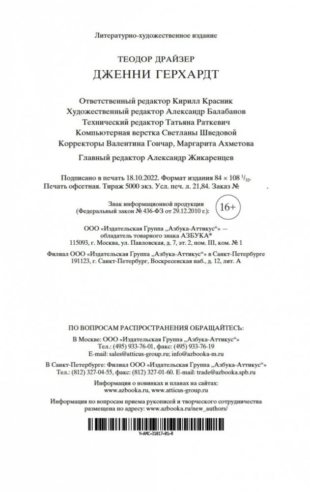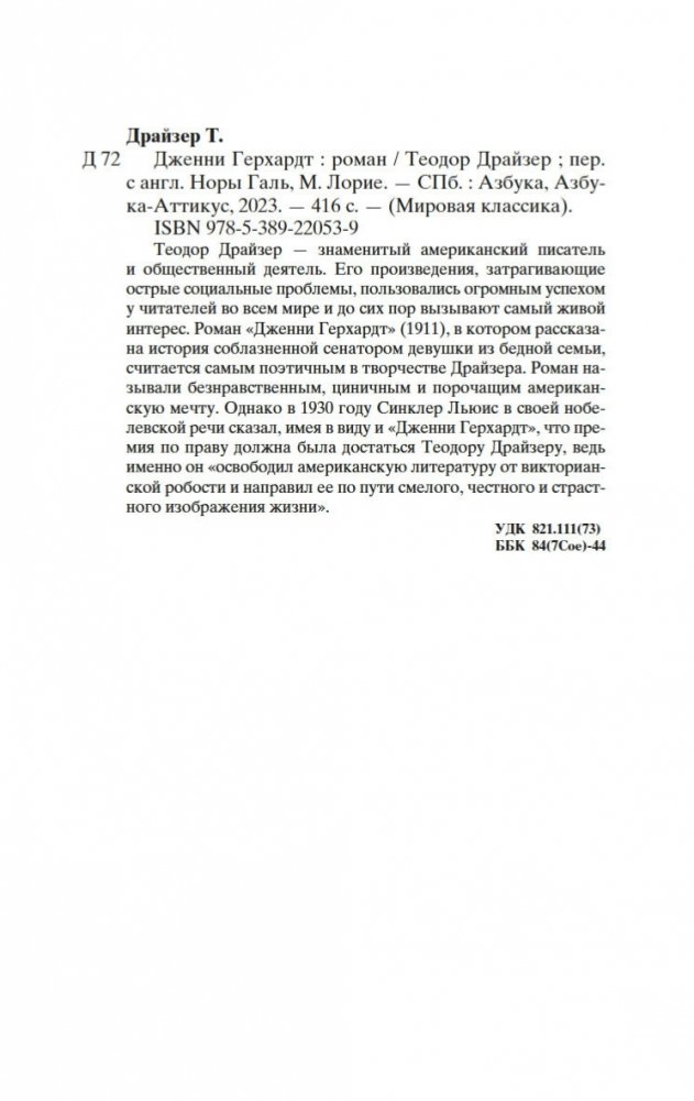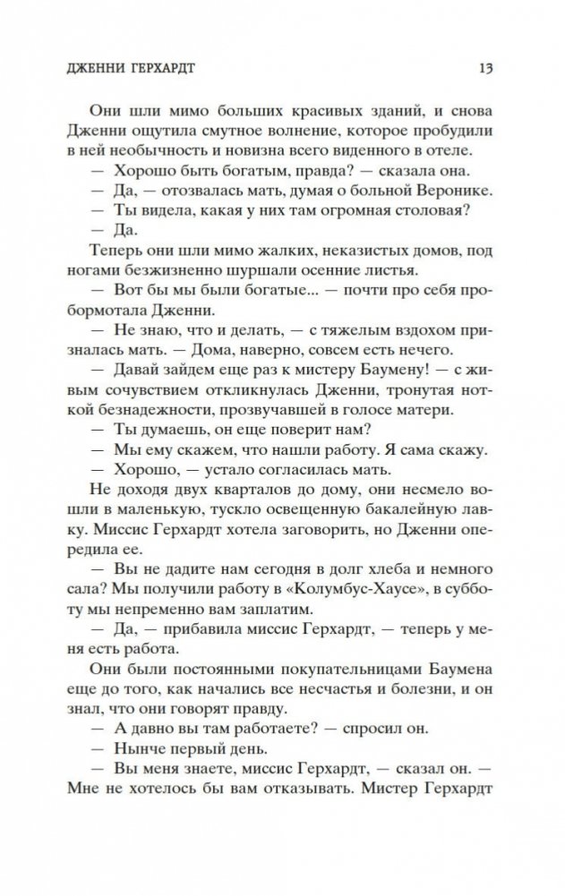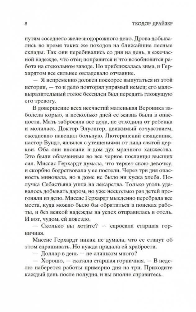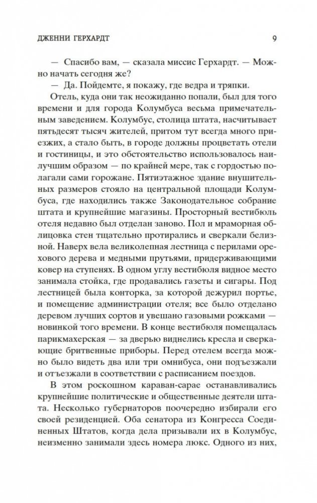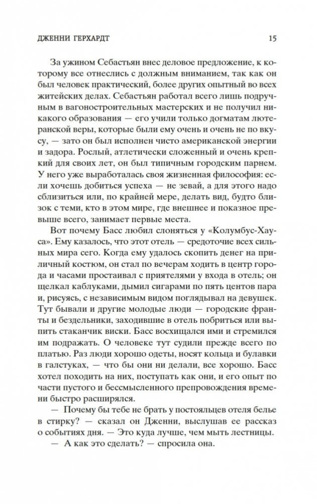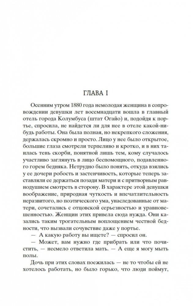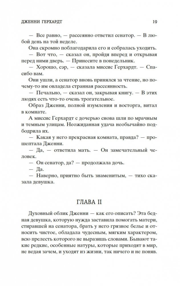 Теодор Драйзер — знаменитый американский писатель и общественный деятель. Его произведения, затрагивающие острые социальные проблемы, пользовались огромным успехом у читателей во всем мире и до сих пор вызывают самый живой интерес. Роман «Дженни Герхардт» (1911), в котором рассказана история соблазненной сенатором девушки из бедной семьи, считается самым поэтичным в творчестве Драйзера. Роман называли безнравственным, циничным и порочащим американскую мечту. Однако в 1930 году Синклер Льюис в своей нобелевской речи сказал, имея в виду и «Дженни Герхардт», что премия по праву должна была достаться Теодору Драйзеру, ведь именно он «освободил американскую литературу от викторианской робости и направил ее по пути смелого, честного и страстного изображения жизни».
