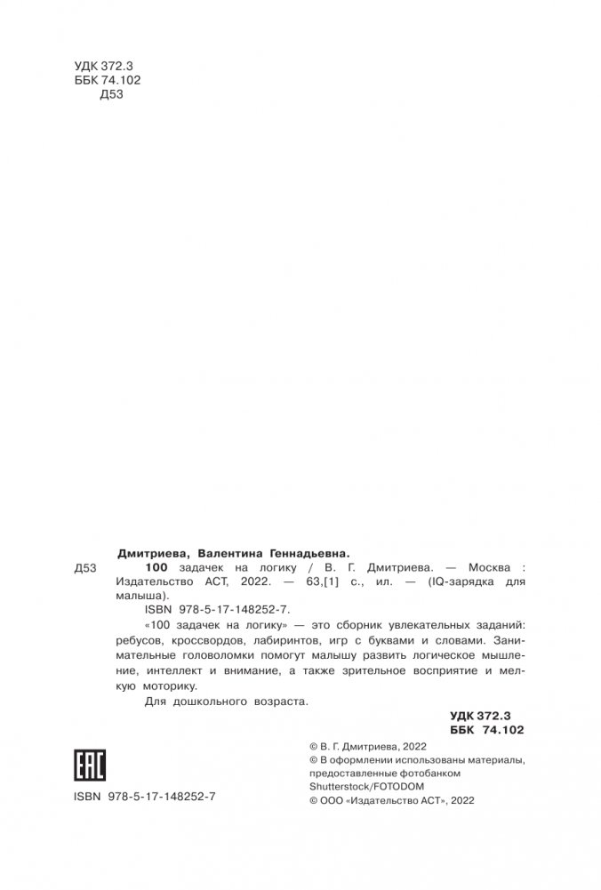 «100 задачек на логику» — это сборник увлекательных заданий: ребусов, кроссвордов, лабиринтов, игр с буквами и словами. Занимательные головоломки помогут малышу развить логику, интеллект и внимание, зрительное восприятие и мелкую моторику.
