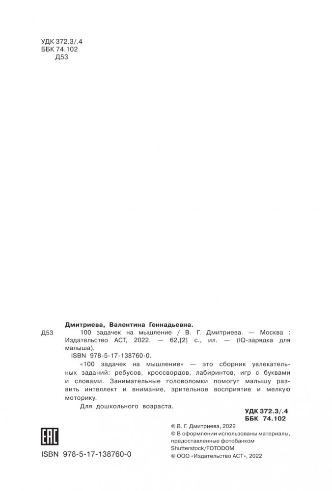 «100 задачек на мышление» — это сборник увлекательных заданий: ребусов, кроссвордов, лабиринтов, игр с буквами и словами. Занимательные головоломки помогут малышу развить интеллект и внимание, зрительное восприятие и мелкую моторику.
