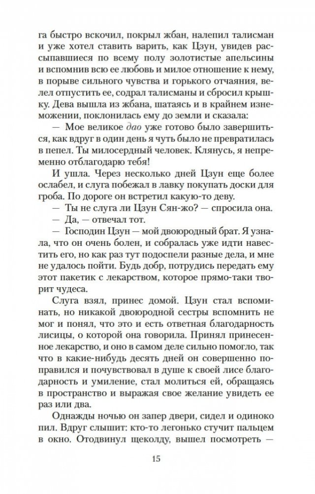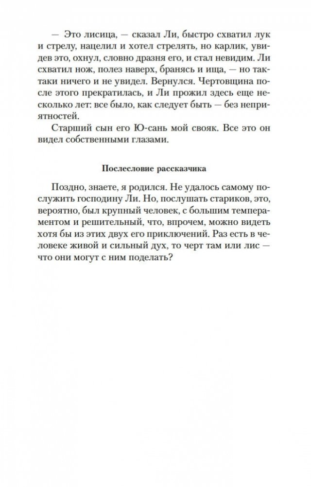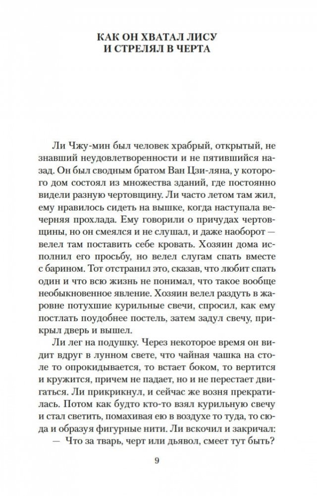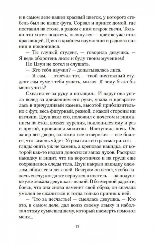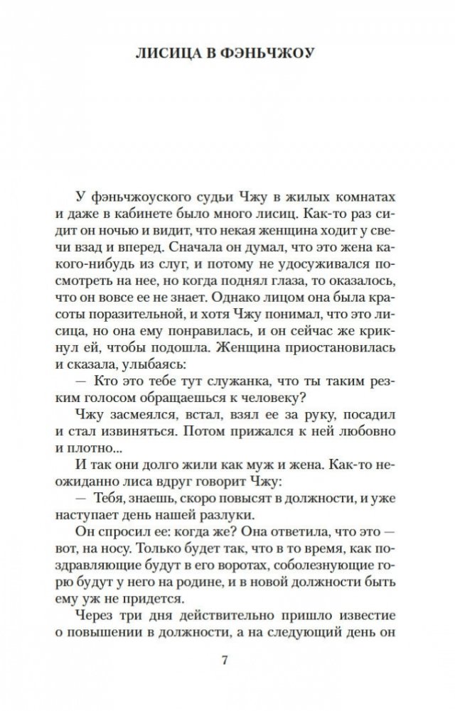 Вот уже три столетия в любой китайской книжной лавке можно найти сборник рассказов Пу Сун-лина, в котором читателя ожидают удивительные истории: о лисах-оборотнях, о чародеях и призраках, о странных животных, проклятых зеркалах, говорящих птицах, оживающих картинах и о многом, многом другом. На самом деле книги Пу Сун-лина давно перешагнули границы Китая, и теперь их читают по всему миру на всех основных языках. Автор их был ученым конфуцианского воспитания, и, строго говоря, ему вовсе не подобало писать рассказы о всевозможных чудесах и содержащие эротические мотивы. Однако Пу Сун-лин прославился именно такими книгами, став самым известным китайским писателем своего времени. Почвой для его творчества послужили народные притчи, но с течением времени авторские истории сами превратились в фольклор и передавались из уст в уста простыми сказителями. В настоящем издании публикуются рассказы Пу Сун-лина о феях-лисицах и монахах-волшебниках, которые «являются к людям, чтобы, смешав действительность с миражем, резко и определенно отделить достойного человека от злодеев». Тексты сопровождают подробные примечания филолога-китаиста Василия Михайловича Алексеева.