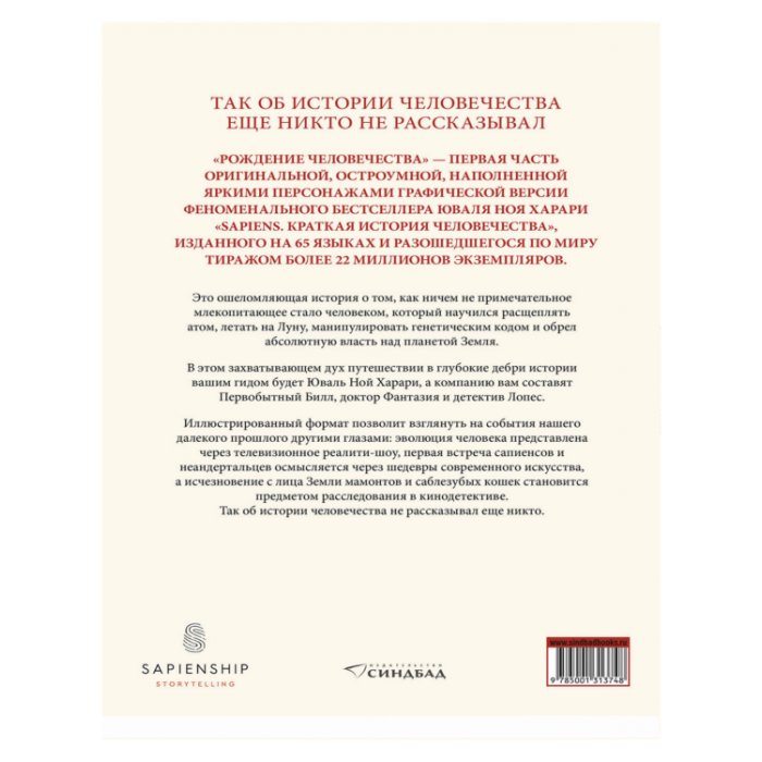 «Рождение человечества» — первая часть оригинальной графической адаптации всемирного бестселлера Юваля Ноя Харари «Sapiens. Краткая история человечества» — книги о том, как человек разумный, бывший когда-то одним из нескольких видов людей, не игравшим в экосистеме Земли какой-либо заметной роли, сумел стать единственным человеческим видом на ней, научился расщеплять атом, летать на Луну, изменять генетический код и превратился в полновластного властителя всей планеты.