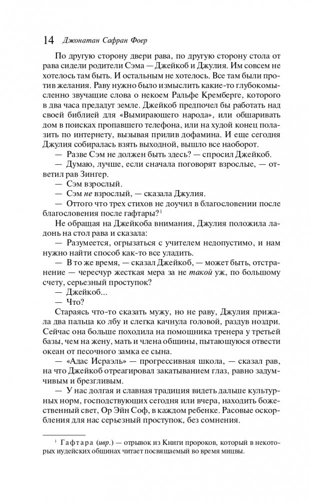 Последний художественный роман Фоера ждали более десяти лет. «Вот я» — масштабное эпическое повествование, книга, явно претендующая на звание большого американского романа. Российский читатель обязательно вспомнит всем известную цитату из «Анны Карениной»: «Каждая семья несчастлива по-своему». Для героев романа «Вот я», Джейкоба и Джулии, полжизни проживших в браке и воспитавших трех сыновей, разлад воспринимается не просто как несчастье — как конец света. Частная трагедия усугубляется трагедией глобальной — сильное землетрясение на Ближнем Востоке ведет к нарастанию военного конфликта. Рвется связь времен и связь между людьми — одиночество ощущается с доселе невиданной остротой, каждый оказывается наедине со своими страхами.