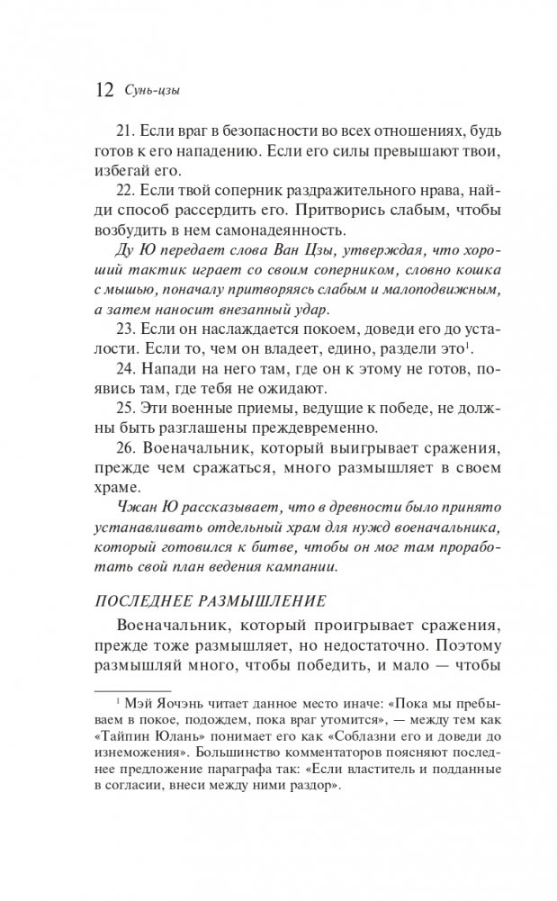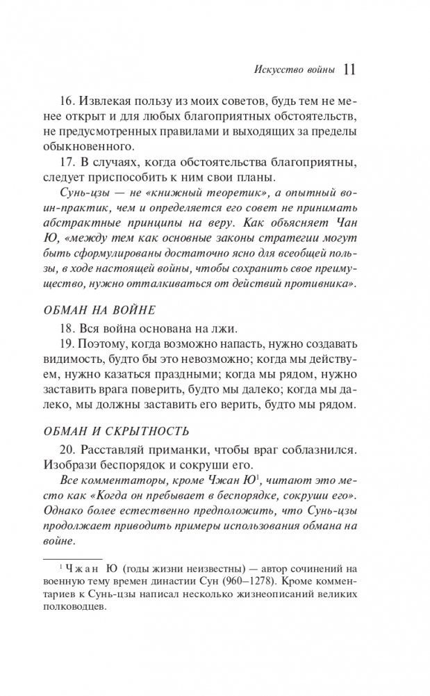 Но это только в узком чисто военном смысле. Борьба на войне не отличается по своей природе от борьбы вообще: это такая же борьба, как и всякая другая, ведущаяся не военными средствами.Сунь Цзы ставит ее в один ряд с борьбой дипломатической, с борьбой политической. Неудивительно, что в наши дни древнее «Искусство войны» привлекает не столько правителей и их генералов, сколько бизнесменов, успешно использующих положения «Искусства войны» для задач управления и разрешения конфликтов.