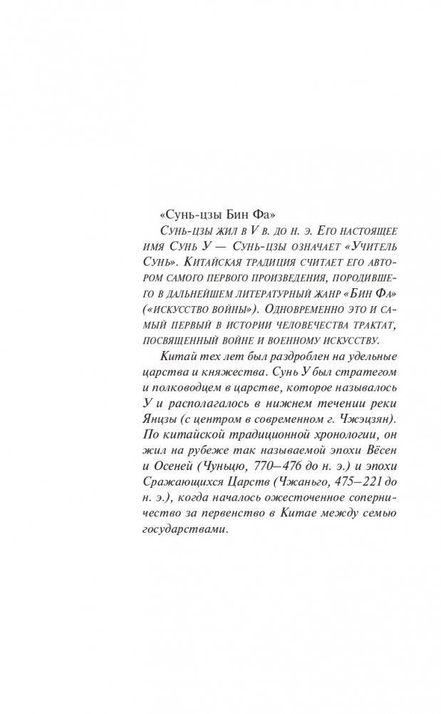 Сунь-Цзы жил в V в. до н.э. Его настоящее имя, Сунь-У-Сунь-Цзы, означает «Учитель Сунь». Китайская традиция считает его автором самого первого произведения, породившего в дальнейшем литературный жанр «Бин Фа» («Искусство войны»). Одновременно это и самый первый в истории человечества трактат, посвященный войне и военному искусству.