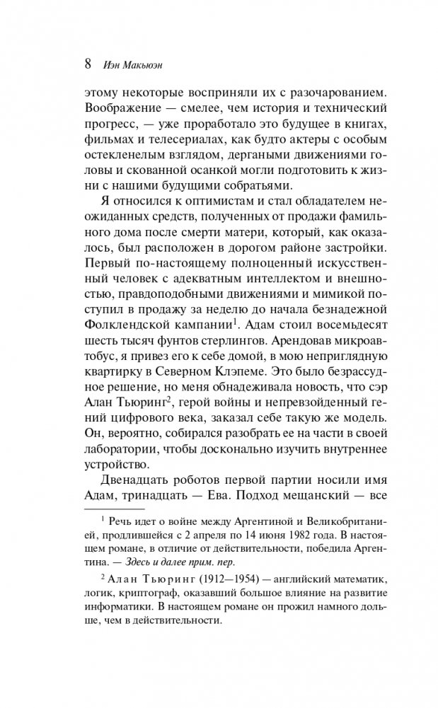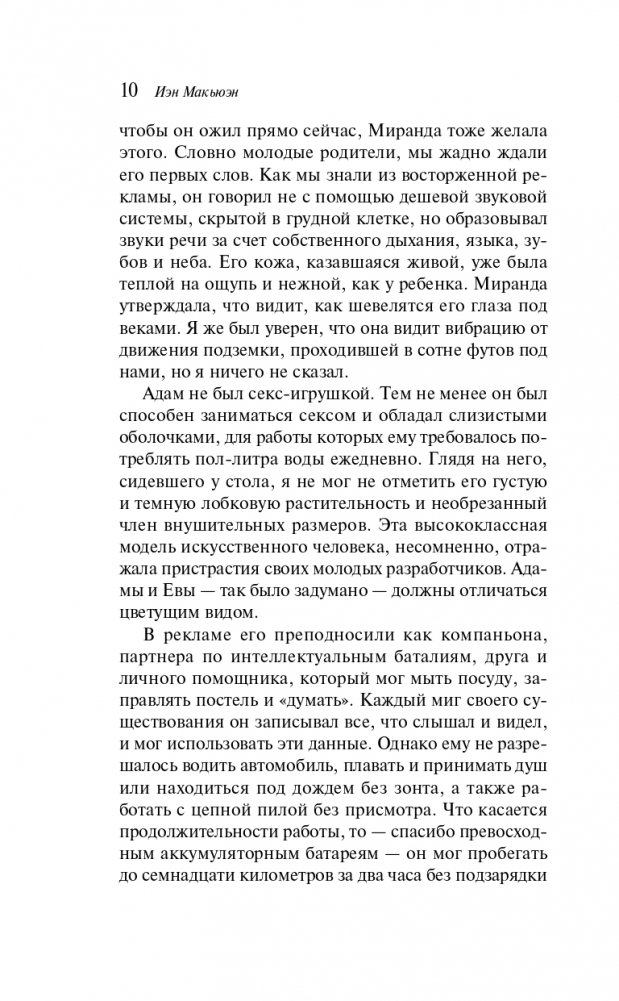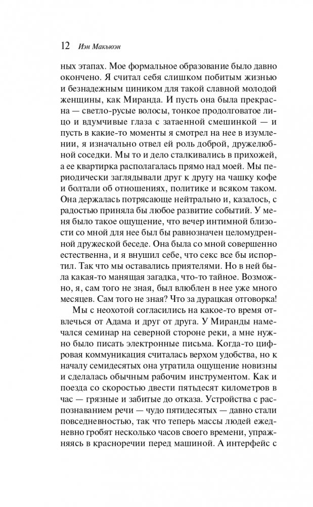 От автора современной британской прозы, знаменитого своими романами «Амстердам», «Искупление», «Невыносимая любовь» и многих других, лауреата Букеровской премии Йэна Макьюэна. Интеллектуальная проза во всех смыслах. На фоне политической ситуации в Англии, когда пришло время Маргарет Тэтчер покидать пост премьер-министра, а в науке Алан Тьюринг сделал прорыв в области создания искусственного интеллекта, развивается история главных героев.