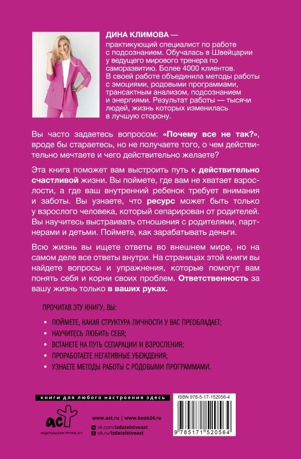 Дина Климова — практикующий специалист по работе с подсознанием. В своей работе объединила методы работы с эмоциями, родовыми программами, трансактным анализом, подсознанием и энергиями.