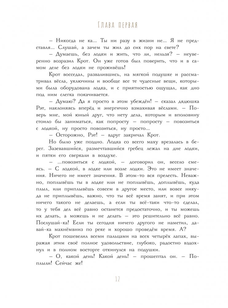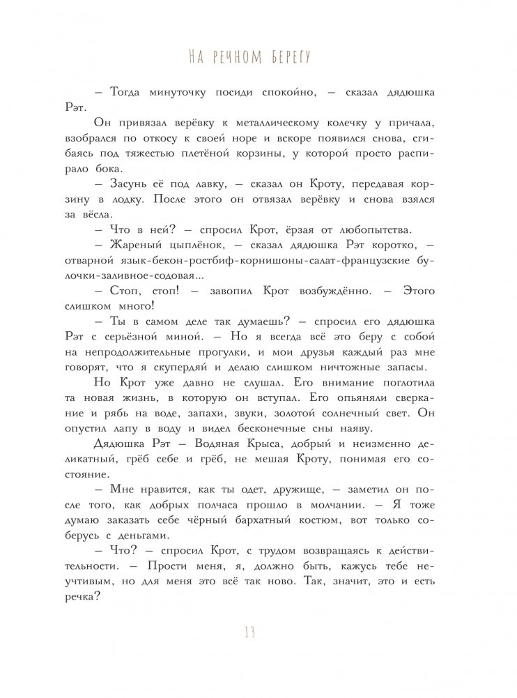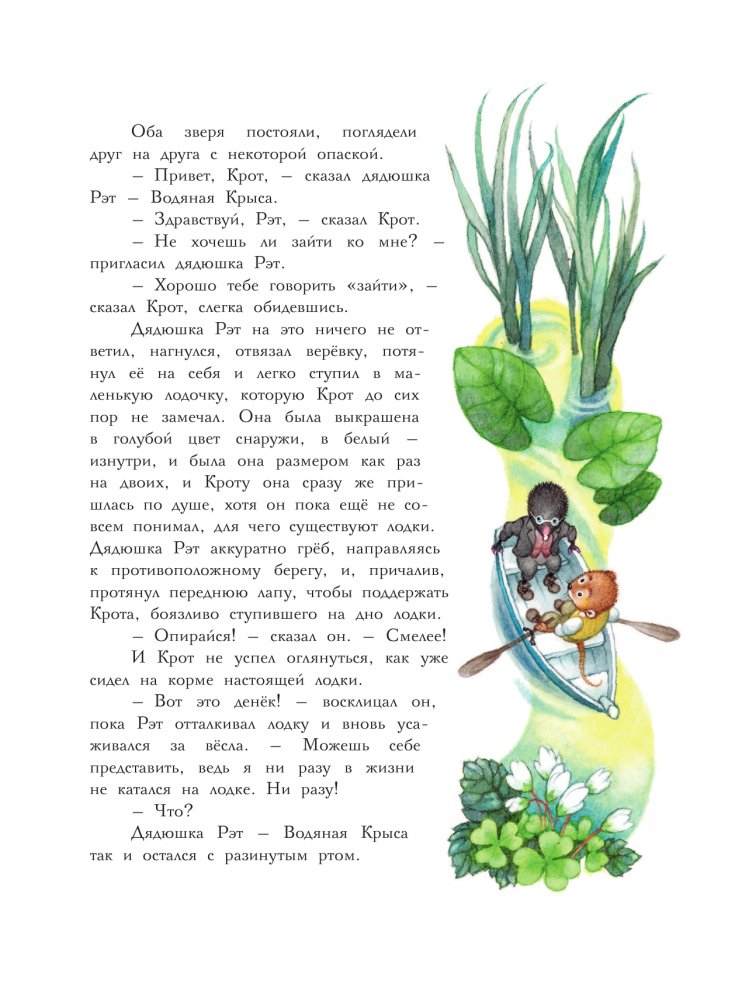 Хорошо жить у реки в тёплом, уютном доме, полном вкусных запасов! Посиживать в кресле у камина, коротая ненастные вечера. Вести долгие беседы с добрыми соседями. А в хорошие дни пройтись по реке на лодке и навестить друзей. Так и жили мистер Барсук, мистер Крот, дядюшка Рэт (водяная крыса) и мистер Тоуд (жаба). Только не думайте, что эти почтенные господа были скучными домоседами! Они из тех, кто всегда готов к приключениям и дальним странствиям. Только позовите! Рисунки Ольги Ионайтис, лауреата XV Международного конкурса «Образ книги» 2022 за иллюстрации к книге «Ветер в ивах».