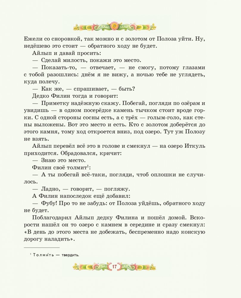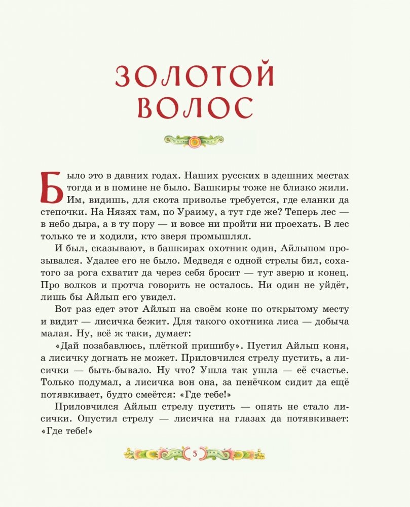 В книгу вошли шесть самых "детских" сказов Павла Петровича Бажова: "Золотой Волос", "Про Великого Полоза", "Змеиный след", "Серебряное копытце", "Огневушка-Поскакушка", "Синюшкин колодец".