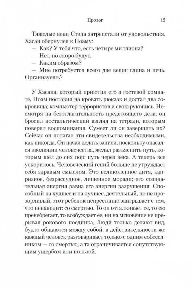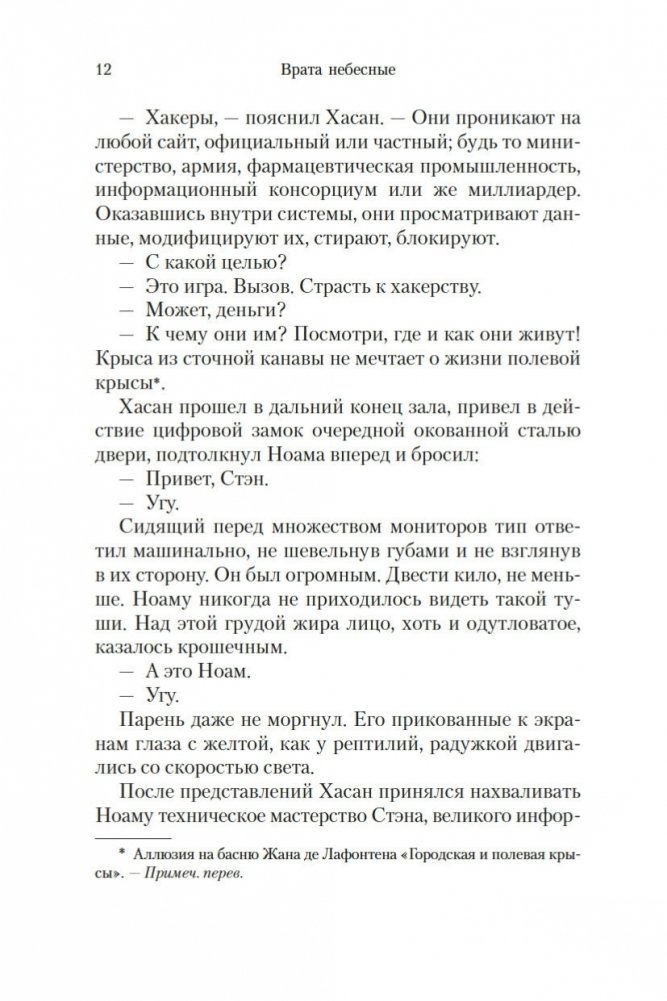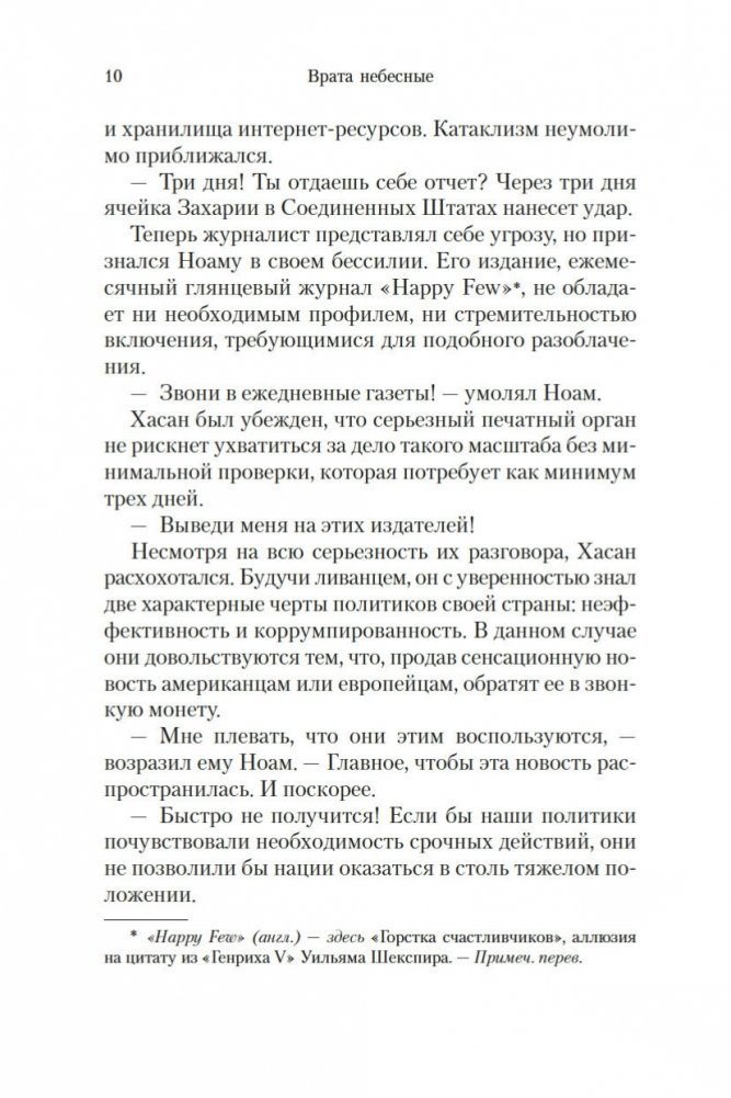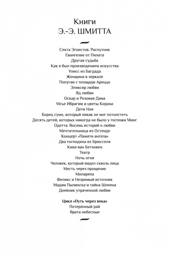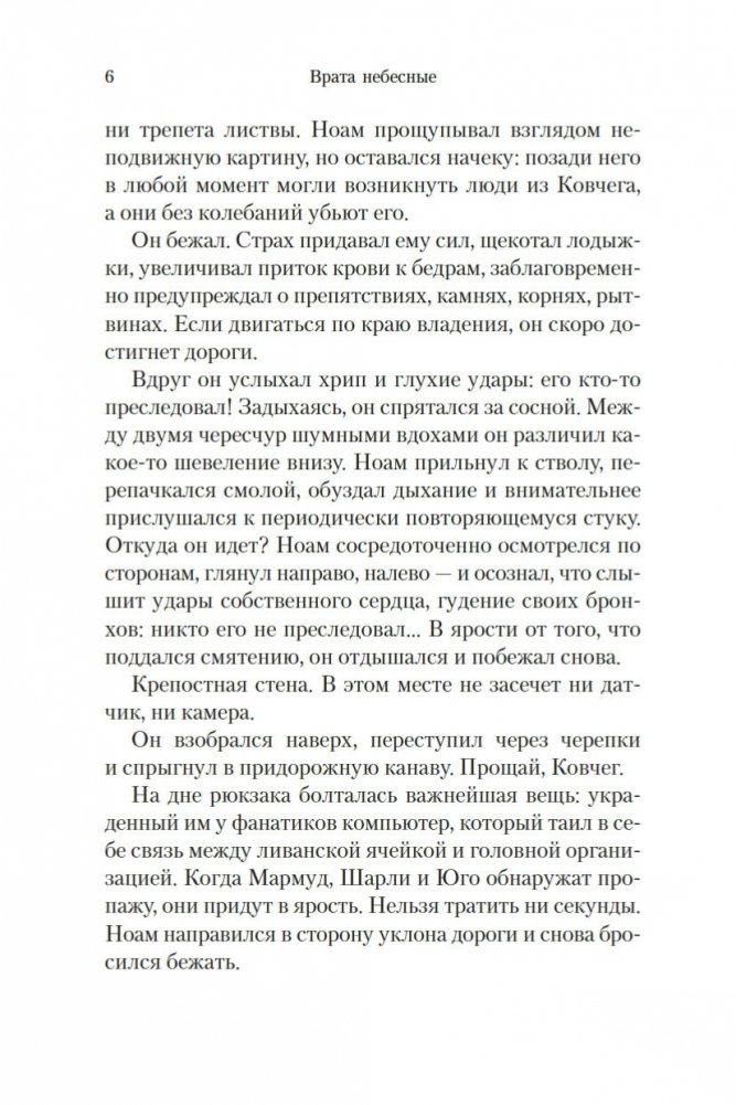 Эрик-Эмманюэль Шмитт — мировая знаменитость, лауреат Гонкуровской премии и многих других наград. Его роман «Оскар и Розовая Дама» читатели назвали книгой, изменившей их жизнь, наряду с Библией, «Маленьким принцем» и «Тремя мушкетерами». Его романы переведены на 45 языков и во Франции каждый год выходят общим тиражом полмиллиона экземпляров. «Врата небесные» — второй том грандиозной философско-романтической саги Шмитта «Путь через века». В первом томе «Потерянный рай» бессмертный целитель Ноам пережил всемирный потоп, в дальнейшем ему предстоит увидеть и Древний Египет, и Ренессанс, и индустриальную революцию, а пока в поисках своей бессмертной возлюбленной — невероятной Нуры, единственной на все тысячелетия, — он приходит в Месопотамию, где человечество изобрело сохранившийся и поныне способ жить сообща. Крупные города вместо мелких деревень; укрощение рек и ирригация вместо деликатного и смиренного поклонения Природе; изобретение астрономии и письма — на глазах у вечного скитальца творится тот самый прогресс, ради которого человечество жертвует собой с начала своей истории. И венец этого прогресса — Башня до небес, до самого обиталища богов, которую возводят рабы по приказу царя Нимрода. Целитель вхож в любые дома — к рабам и к царице Кубабе, к придворному астрологу и к пастуху Авраму, — и перед нами во всех подробностях распахивается головокружительная эпоха, от которой человечество так много унаследовало. Впервые на русском!