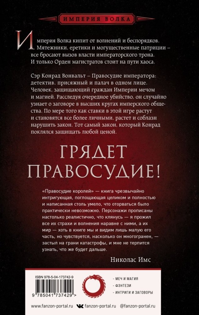 Интриги и магия сталкиваются в этом эпическом фэнтези о сэре Конраде Вонвальте, Правосудии императора, который является детективом, судьей и палачом в одном лице.