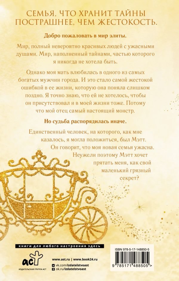 Однако моя мать влюбилась в одного из самых богатых мужчин города. И это стало самой жестокой ошибкой в ее жизни, которую она поняла слишком поздно. Я точно знаю, что ей не хотелось, чтобы он присутствовал и в моей жизни тоже. Потому что мой отец самый настоящий монстр.