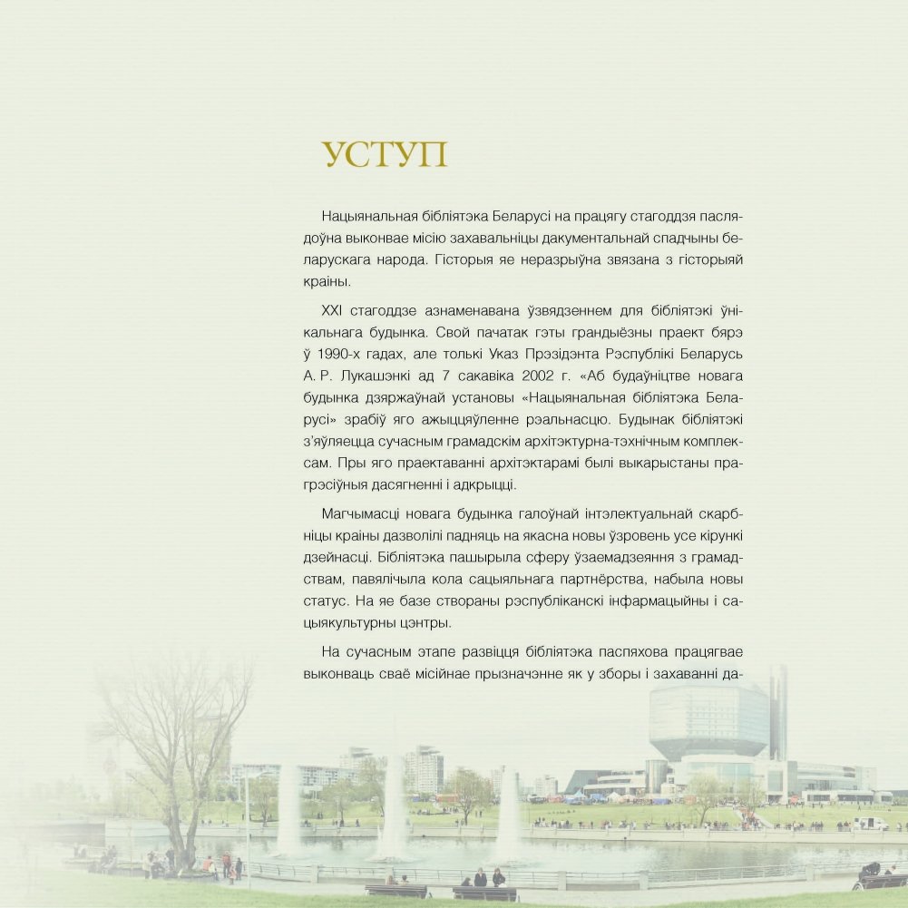 Фотаальбом прысвечаны 100-годдзю Нацыянальнай бібліятэкі Беларусі. На яго старонках змешчаны фотаздымкі, якія храналагічна адлюстроўваюць важнейшыя падзеі ад пачатку заснавання бібліятэкі да сучаснасці. Выданне разлічана на ўсіх, каго цікавіць гісторыя станаўлення і развіцця галоўнай універсальнай навуковай бібліятэкі краіны.