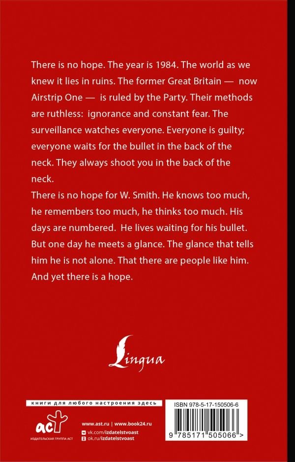 Книга издана в неадаптированной версии. Наслаждаясь языком и новоязом Дж. Оруэлла в оригинале, не забывайте, что БОЛЬШОЙ БРАТ ПРИСМАТРИВАЕТ ЗА ВАМИ.