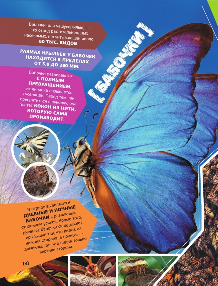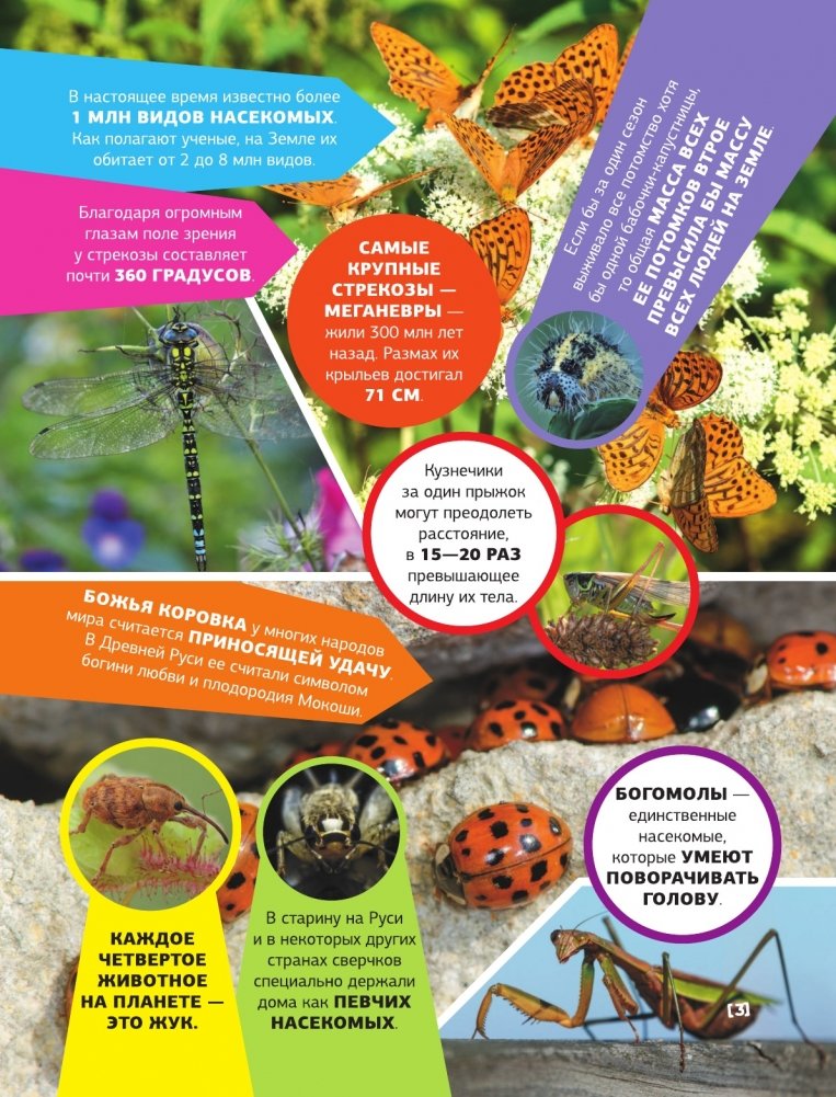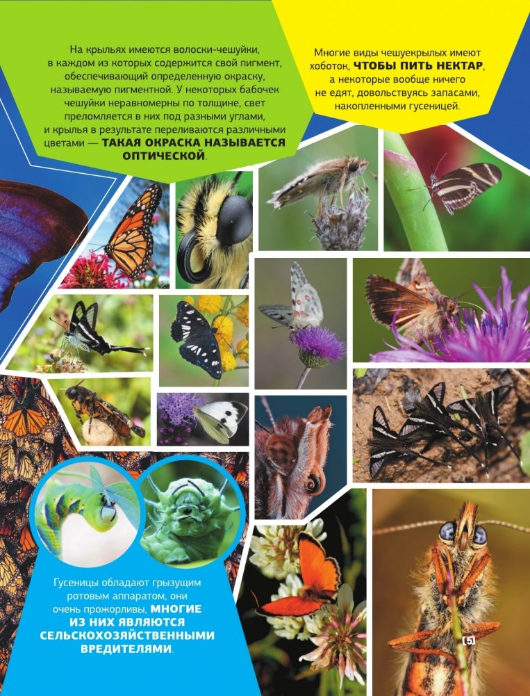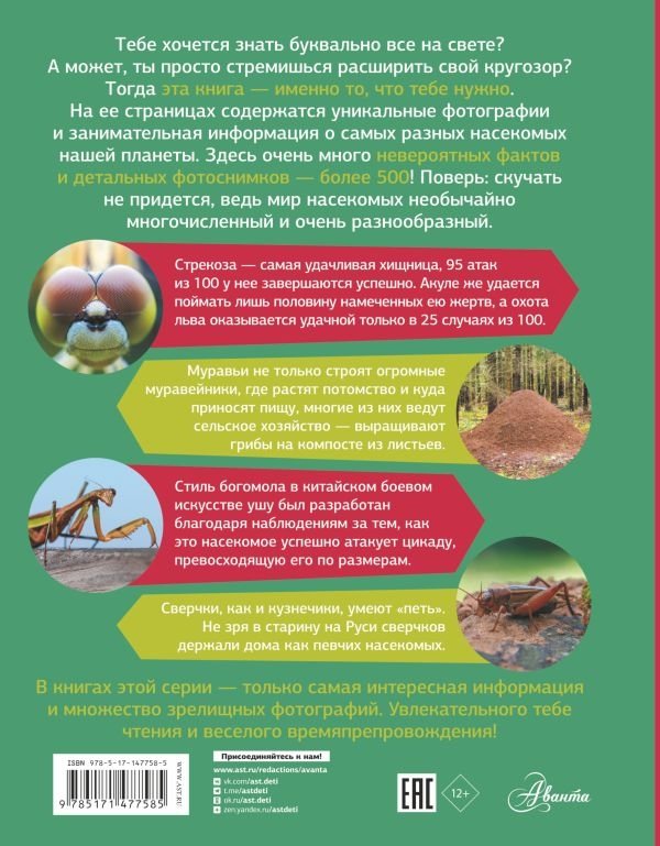 Эта энциклопедия знакомит детей с миром насекомых нашей планеты, но делает это в несколько ином формате, чем другие издания. Здесь нет больших описательных статей и научной классификации — лишь короткие факты и уникальные фотографии бабочек и стрекоз, жуков и кузнечиков, пчел и муравьев, а также известных недругов насекомых — пауков. И несмотря на это, юный читатель получит полное представление о том или ином насекомом, ведь приведенная здесь информация не только интересная, но и вполне познавательная, а фотоснимков этих удивительных созданий крупным планом так много, что их можно рассмотреть со всех ракурсов и в мельчайших подробностях.