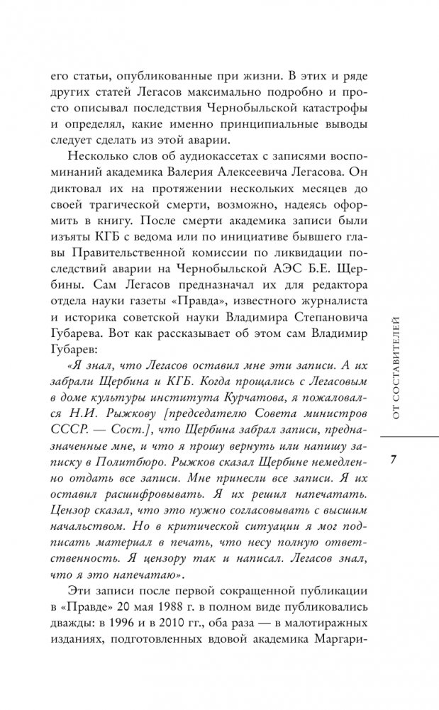 В основе этой книги лежат уникальные материалы: интервью, статьи и воспоминания академика Валерия Легасова, одного из руководителей ликвидации последствий Чернобыльской аварии, который первым в СССР и в мире в целом проанализировал последствия катастрофы и первым подробно рассказал о них. Помимо них, в книгу вошли статьи о технологическом и политическом аспектах катастрофы, написанные с использованием и современных материалов, и ранее не публиковавшихся архивных документов. Книга позволит читателю сформировать свое мнение о Чернобыльской катастрофе вопреки псевдонаучным теориям и политизированным популистским схемам.