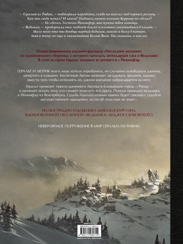 Красочные и детальные картины Микаэля Бургуэна погружают в сюжет «Последнего желания» — знаменитого рассказа Анджея Сапковского, который полностью изложен в этой же книге и был показан в 5-ой серии 1-го сезона сериала «Ведьмак». Читайте и наслаждайтесь атмосферными иллюстрациями со всеми ключевыми событиями.