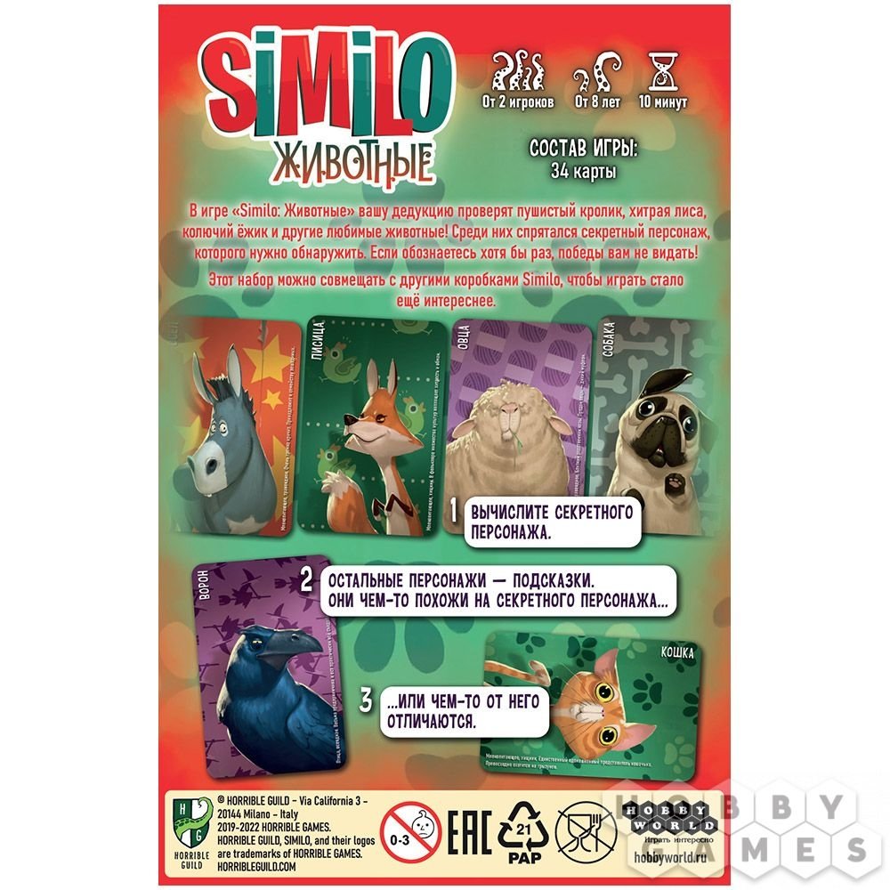"Similo: Животные" – это кооперативная игра, в ней вам нужно действовать совместно – вместе же вы выиграете или проиграете. Вы победите, когда на столе не останется ни одной карты, кроме секретной. Но если вы решите выкинуть её – вам тут же засчитается поражение