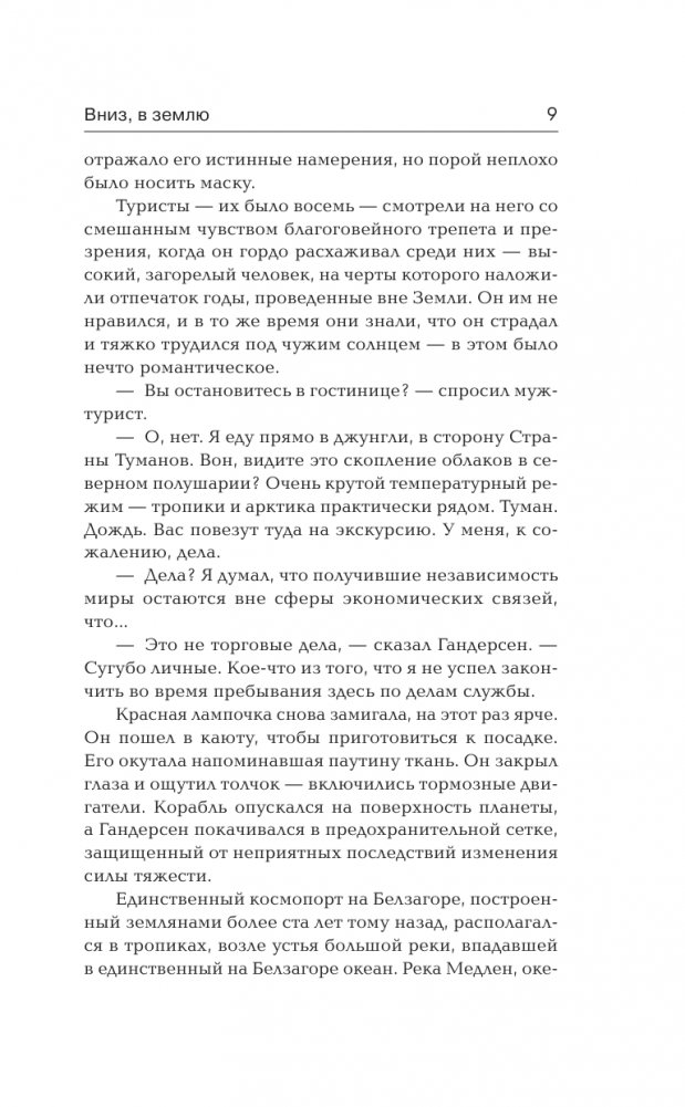 «Вниз, в землю». Эдмунд Гандерсен после долгих лет отсутствия возвращается на планету Белзагор, где когда‑то работал. Сейчас контроль над планетой возвращен ее коренным жителям — слоноподобным нилдорам, а землян здесь осталось совсем мало. Гандерсен, мучимый раскаянием за нанесенные нилдорам увечья, намерен отправиться вместе с ними в Северные земли ради тайного ритуала «второго рождения», обновляющего дух и тело. Никто из жителей Земли никогда такого не делал, и Гандерсен пребывает в сомнениях, не приведет ли его решение к роковым последствиям...