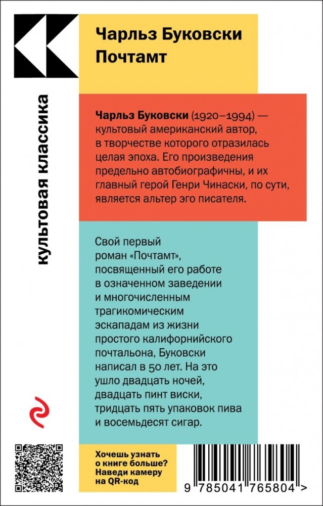 Свой первый роман "Почтамт", посвященный его работе в означенном заведении и многочисленным трагикомическим эскападам из жизни простого калифорнийского почтальона, Буковски написал в 50 лет. На это ушло двадцать ночей, двадцать пинт виски, тридцать пять упаковок пива и восемьдесят сигар.