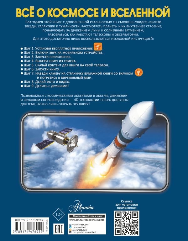 Все ребята, увлеченные космосом, были бы рады не просто прочитать очередную книгу о нем, а рассмотреть со всех сторон и даже внутри планеты и их спутники, звезды и кометы, изучить Млечный Путь, черные дыры и астероиды, изучить устройство космической техники, начиная с телескопов и заканчивая орбитальными комплексами, и увидеть своими глазами их в действии. Теперь есть такая возможность! Ведь перед тобой книга с дополненной реальностью, а это значит, что ты познакомишься с планетами Солнечной системы и другими объектами и явлениями Вселенной в объеме, движении и звуковом сопровождении. У каких планет есть кольца? Что такое криовулканы и на какой планете встречаются самые крупные из них? Зачем на борту станции "Вояджер-2" закреплена золотая пластина с записью земных звуков и изображений? Что вызывает возникновение на Солнце корональных петель? Какая страна запустила первой пилотируемый спутник? Сколько насчитывается астероидов опасных для Земли? На какой планете последние 350 лет бушует рекордный по размерам и мощности ураган? На эти и многие другие вопросы ты найдешь ответы в настоящем издании, посвященном различным космическим объектам и явлениям.