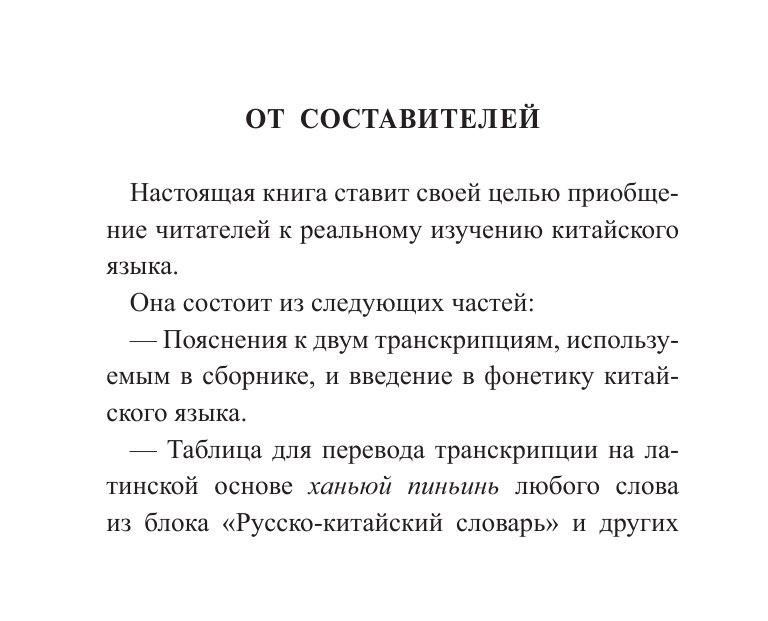 Книга состоит из четырех частей. В фонетической части даются базовые сведения о звуковом составе китайского языка и о возможных транскрипциях. В Грамматике представлены основные сведения о грамматическом строе китайского языка, при этом правила богато проиллюстрированы примерами. Разговорник знакомит с актуальной лексикой в наиболее распространенных ситуациях и предлагает готовые формулы для построения предложений. Китайско-русский словарь с двумя видами транскрипций поможет освоить произношение и расширить словарный запас.