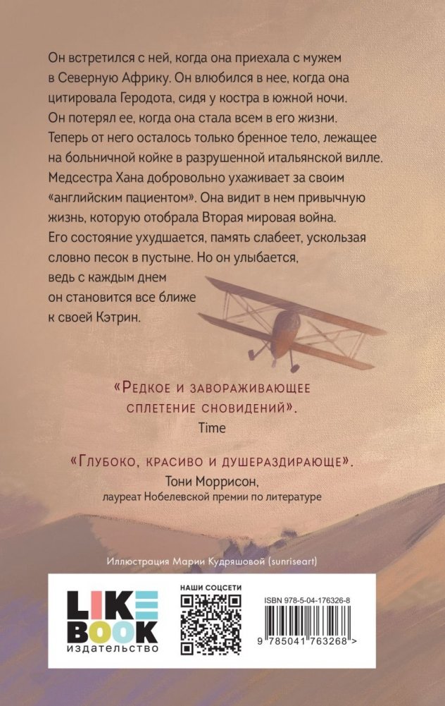 Теперь от него осталось только бренное тело, лежащее на больничной койке в разрушенной итальянской вилле. Медсестра Хана добровольно ухаживает за своим "английским пациентом". Она видит в нем привычную жизнь, которую отобрала Вторая мировая война. Его состояние ухудшается, память слабеет, ускользая словно песок в пустыне. Но он улыбается, ведь с каждым днем он становится все ближе к своей Кэтрин.
