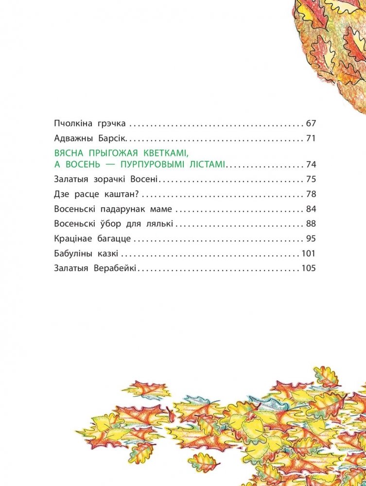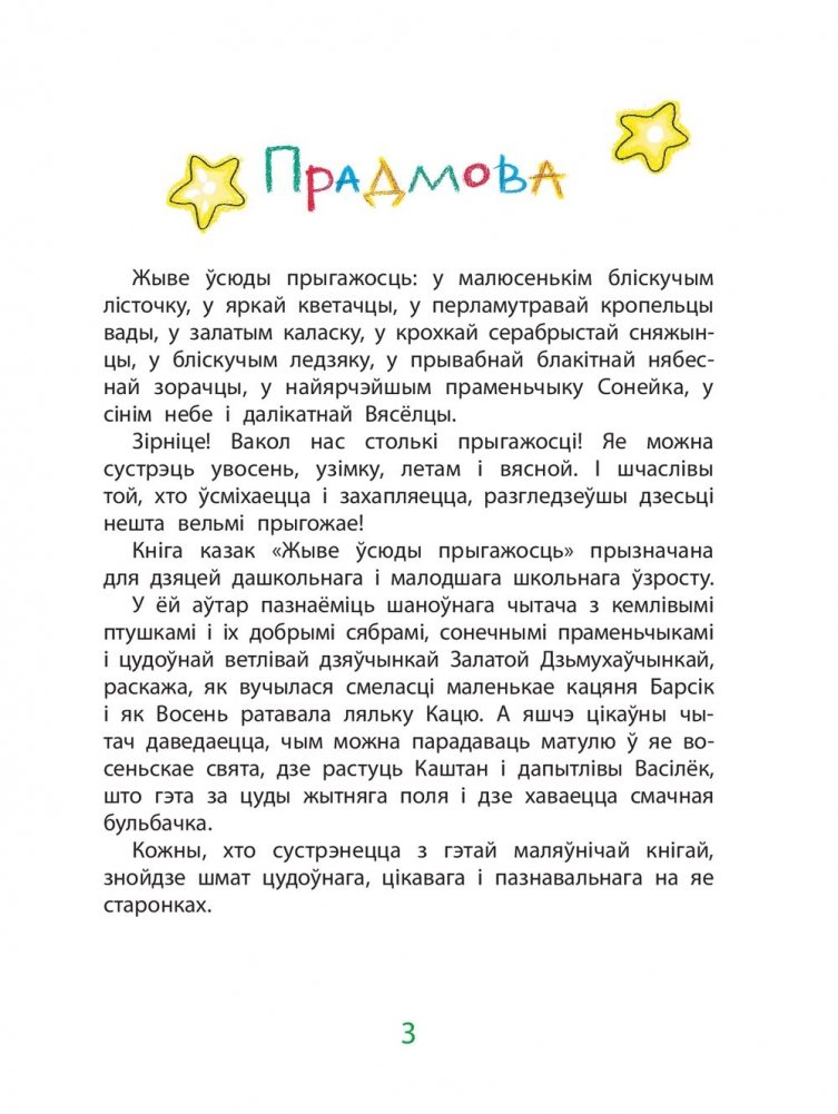 Жыве ўсюды прыгажосць: у малюсенькім бліскучым лісточку, у яркай кветачцы, у перламутравай кропельцы вады, у залатым каласку, у крохкай серабрыстай сняжынцы, у бліскучым ледзяку, у прывабнай блакітнай нябеснай зорачцы, у найярчэйшым праменьчыку Сонейка, у сінім небе і далікатнай Вясёлцы.