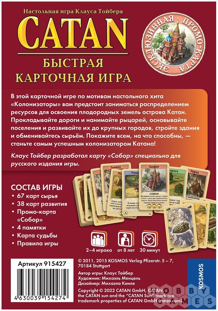 В этой карточной игре по мотивам всемирно известной игры "Колонизаторы" вам предстоит заниматься распределением ресурсов для освоения плодородных земель острова Катан. Возьмите в свои руки функции главного поселенца: прокладывайте дороги и нанимайте рыцарей, основывайте поселения и развивайте их до крупных городов, стройте здания и обменивайтесь ресурсами! Всё в лучших традициях любимой игры, но в компактном карточном решении. Покажите всем, на что вы способны – станьте самым успешным колонизатором Катана!