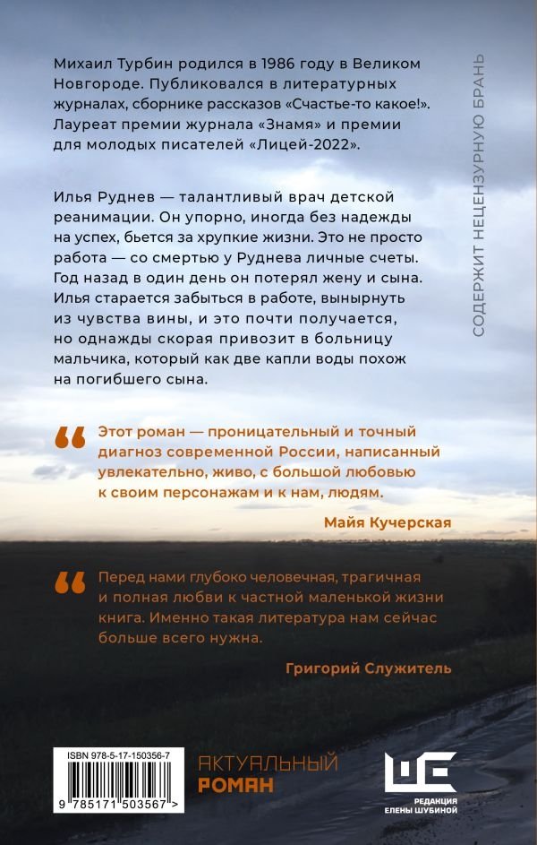 «Выше ноги от земли» — прежде всего классический русский роман, в котором есть все составляющие «большой литературы». Молодой врач Илья Руднев работает детским реаниматологом и тяжело переживает смерть жены и маленького сына. Мир человека, лишившегося опоры и смысла, передан пугающе правдоподобно: описания врачебных будней перемежаются воспоминаниями героя о счастливых днях его жизни, реальность соседствует с галлюцинациями. Михаил Турбин скупо, но предельно точно передает душевное состояние героя и его динамику, незаметно, но верно подготавливая читателя к центральному событию романа.
