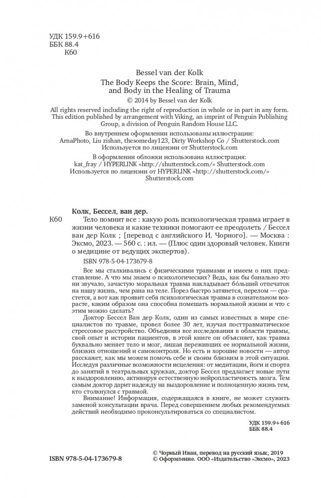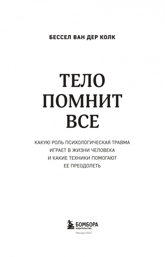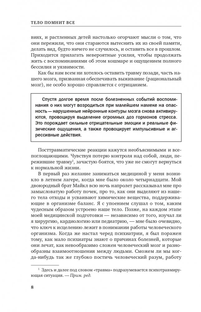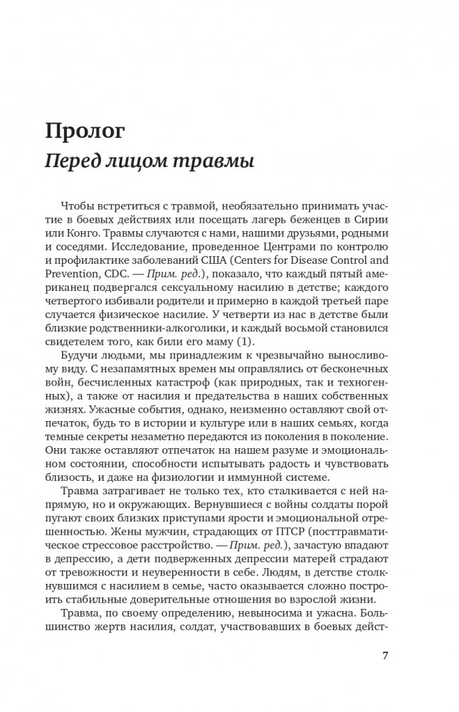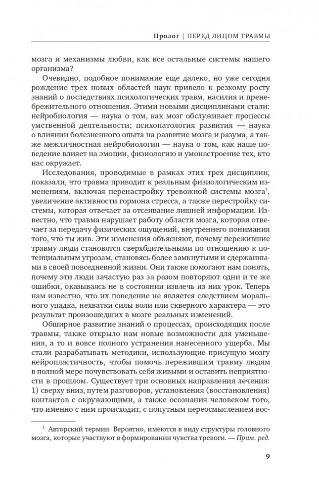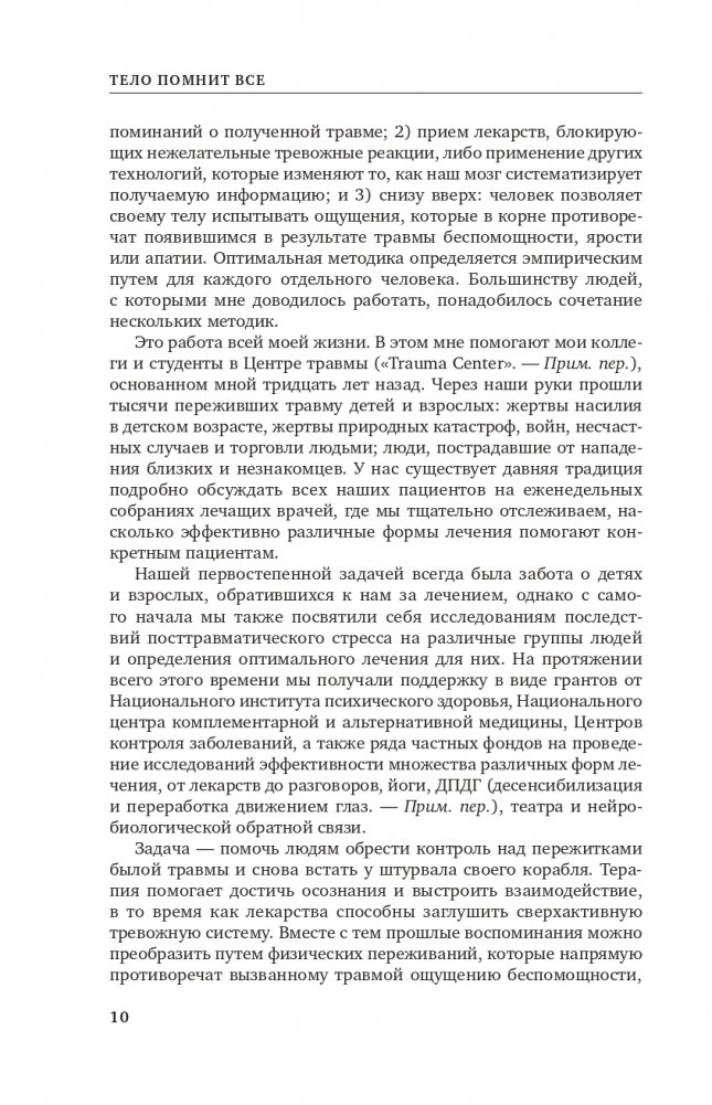 Есть и хорошие новости. Последствия психической травмы можно значительно уменьшить и даже полностью преодолеть. Исследование Бессела ван дер Колка основано на 30-ЛЕТНЕМ ОПЫТЕ РАБОТЫ с людьми, пережившими психологическую травму. Автор предлагает разные ПУТИ ее лечения, включая инструменты нейробиологии, а также спорт и йогу — то есть все, что позволяет восстановить нейропластичность мозга. Эта книга поможет понять, почему мы можем одновременно как ранить друг друга, так и исцелять, и дает надежду на новую жизнь.