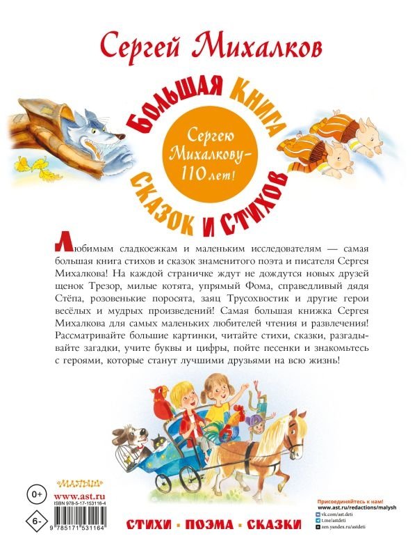 «Большая книга сказок и стихов» — один из самых полных сборников стихов, сказок и загадок писателя-классика Сергея Михалкова для маленьких. Эта огромная книга познакомит с самыми знаменитыми героями Сергея Михалкова и подарит лучших друзей на всю жизнь: дядю Стёпу, трёх поросят, щенка Трезора и многих других. Великолепные ритмичные стихи, мудрые и весёлые сказки, поучительные басни, заковыристые загадки, азбуки и первый счёт — всё это в одной большой книге с огромными картинками. Книга издана к 110-летнему юбилею Сергея Михалкова — поэта, писателя, драматурга, автора Гимна России. По произведениям Сергея Михалкова снимают фильмы и ставят спектакли. Для дошкольного возраста.