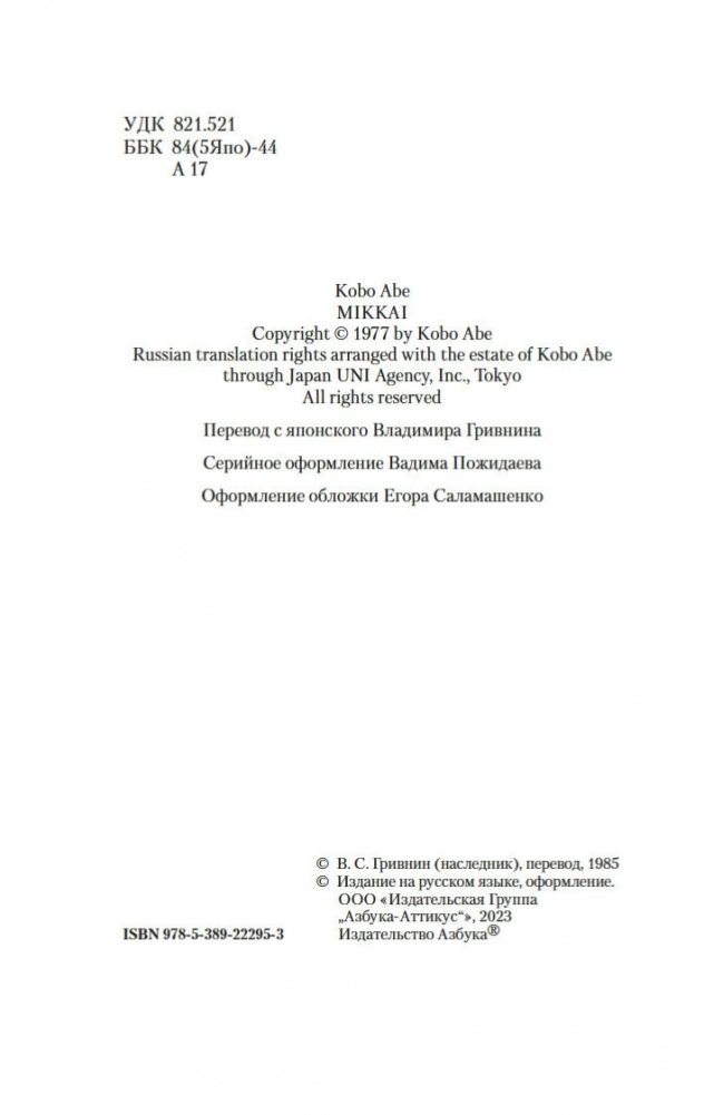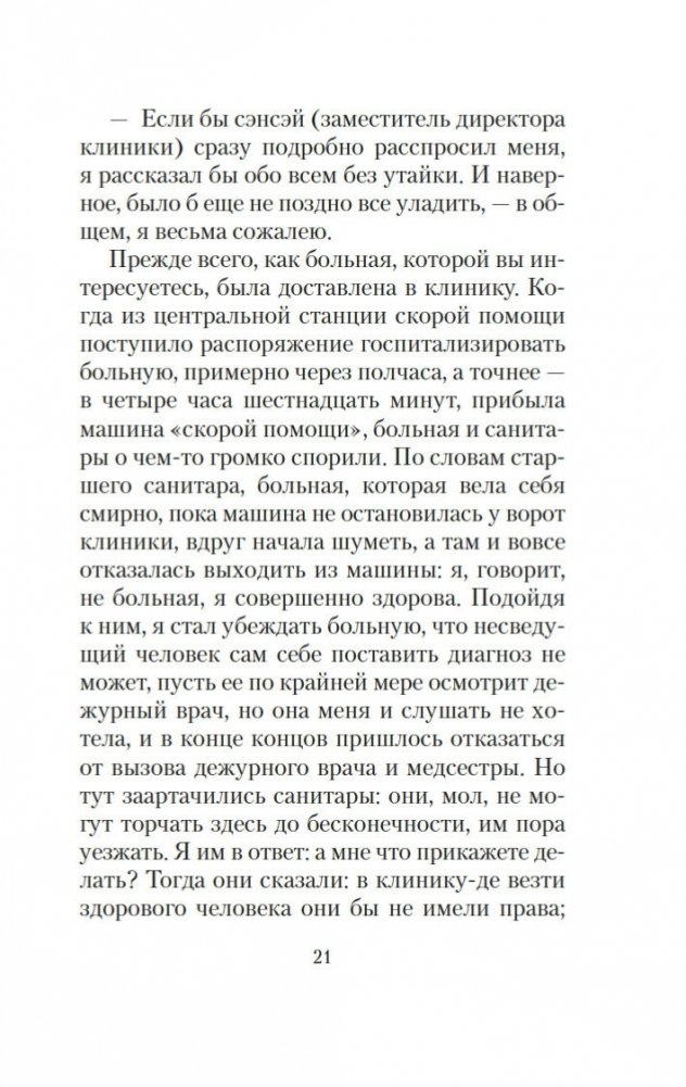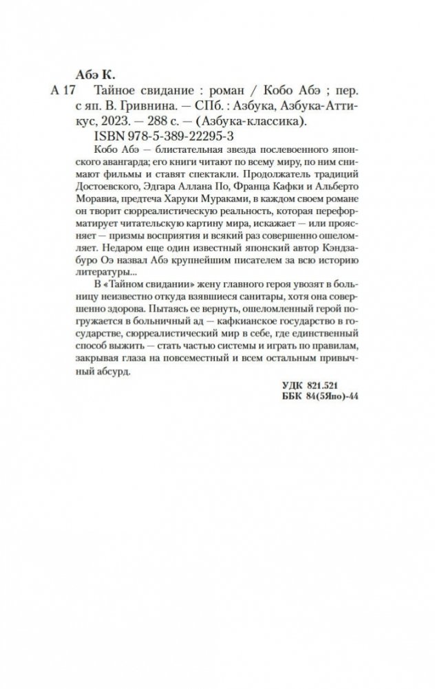 Кобо Абэ — блистательная звезда послевоенного японского авангарда; его книги читают по всему миру, по ним снимают фильмы и ставят спектакли. Продолжатель традиций Достоевского, Эдгара Аллана По, Франца Кафки и Альберто Моравиа, предтеча Харуки Мураками, в каждом своем романе он творит сюрреалистическую реальность, которая переформатирует читательскую картину мира, искажает — или проясняет — призмы восприятия и всякий раз совершенно ошеломляет. Недаром еще один известный японский автор Кэндзабуро Оэ назвал Абэ крупнейшим писателем за всю историю литературы... В «Тайном свидании» жену главного героя увозят в больницу неизвестно откуда взявшиеся санитары, хотя она совершенно здорова. Пытаясь ее вернуть, ошеломленный герой погружается в больничный ад — кафкианское государство в государстве, сюрреалистический мир в себе, где единственный способ выжить — стать частью системы и играть по правилам, закрывая глаза на повсеместный и всем остальным привычный абсурд.