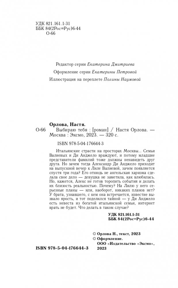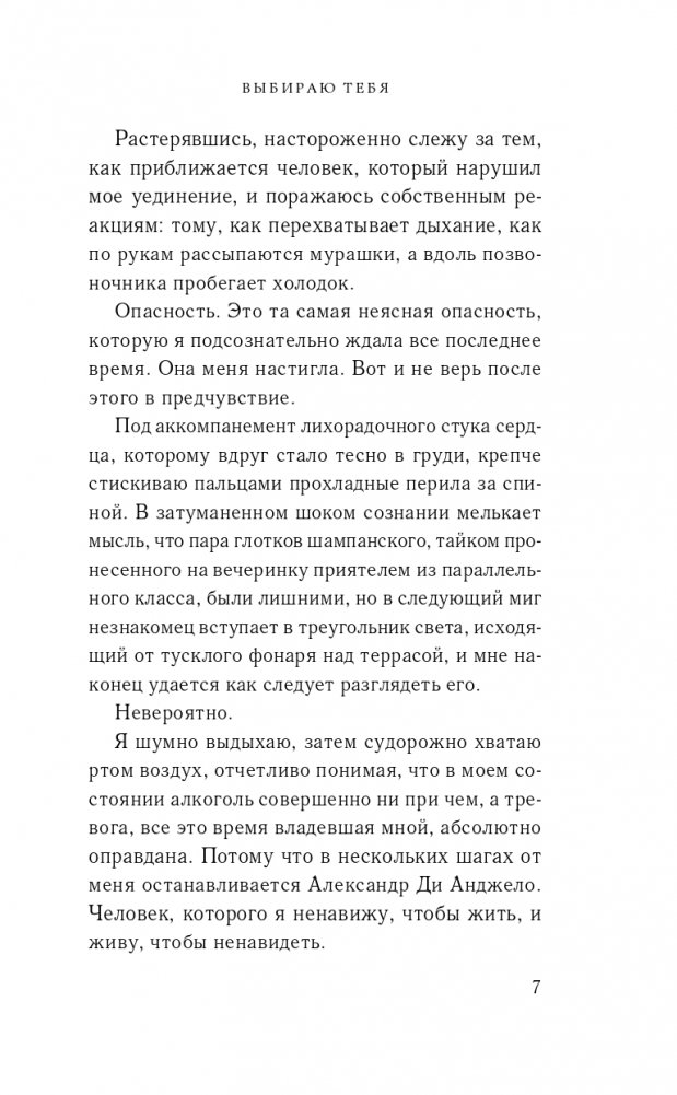 Итальянские страсти на просторах Москвы… Семьи Валиевых и Ди Анджело враждуют, и потому младшие представители фамилий тоже должны ненавидеть друг друга. Но зачем тогда Александр Ди Анджело приходит на выпускной вечер к Лиле Валиевой, зачем появляется спустя три года? Его отнюдь не ангельская харизма сделала свое дело – девушка не заметила, как влюбилась. Но, кажется, Алекс не готов торопить события и делать их близость реальностью. Почему? На Лилю у него серьезные планы – или, наоборот, никаких планов нет? У брата, узнавшего, с кем она встречается, известие вызвало ярость, и тот поделился тайной – у Ди Анджело есть невеста из богатой итальянской семьи, интернет врать не будет. Что делать в таком случае?