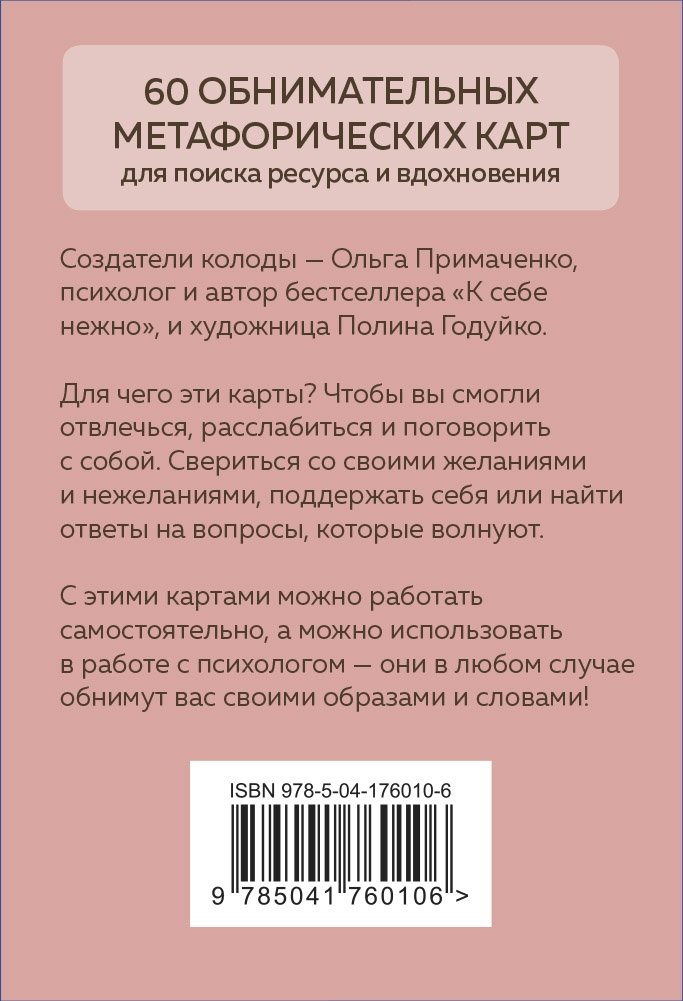 «Себе можно верить» — это 60 обнимательных метафорических карт для поиска ресурса и вдохновения! Создатели колоды — Ольга Примаченко, психолог и автор бестселлера «К себе нежно», и художница Полина Годуйко. Для чего эти карты? Чтобы вы смогли отвлечься, расслабиться и поговорить с собой. Свериться со своими желаниями и нежеланиями, поддержать себя или найти ответы на вопросы, которые волнуют. Внутри коробочки есть книжка-инструкция, которая подробно объяснит, как пользоваться колодой. С этими картами можно работать самостоятельно, а можно использовать в работе с психологом — они в любом случае обнимут вас своими образами и словами! Для чего эти карты? Чтобы вы смогли отвлечься, расслабиться и поговорить с собой. Свериться со своими желаниями и нежеланиями, поддержать себя или найти ответы на вопросы, которые волнуют.