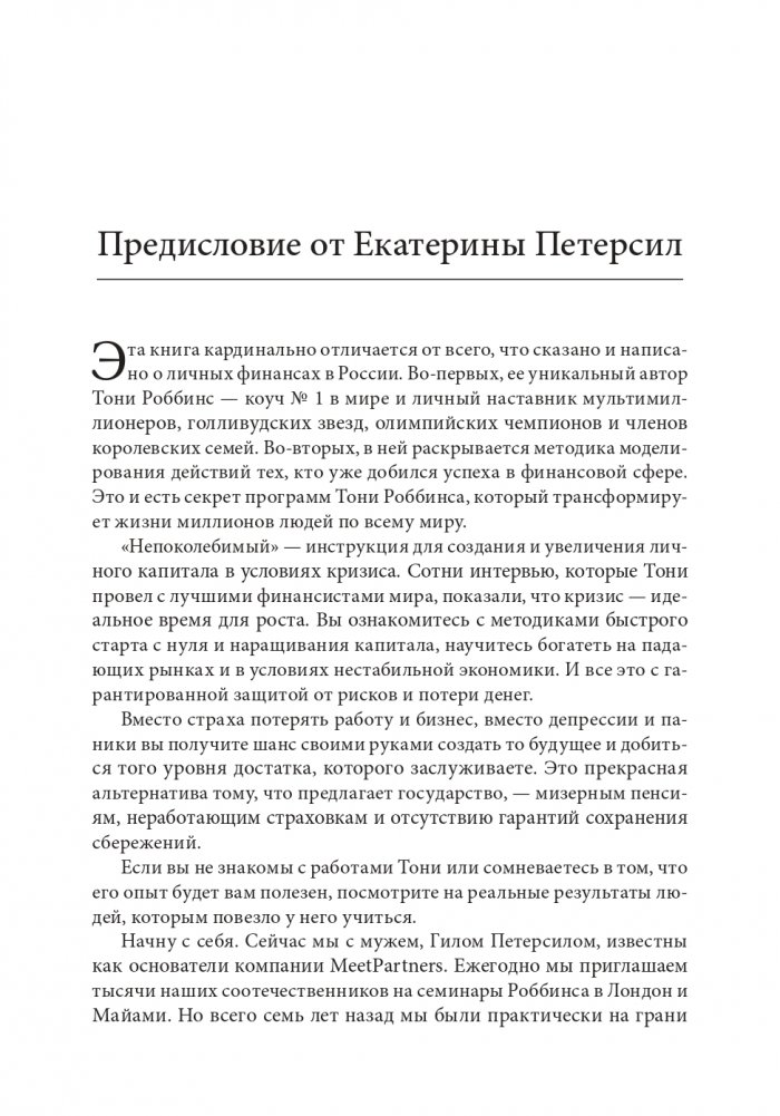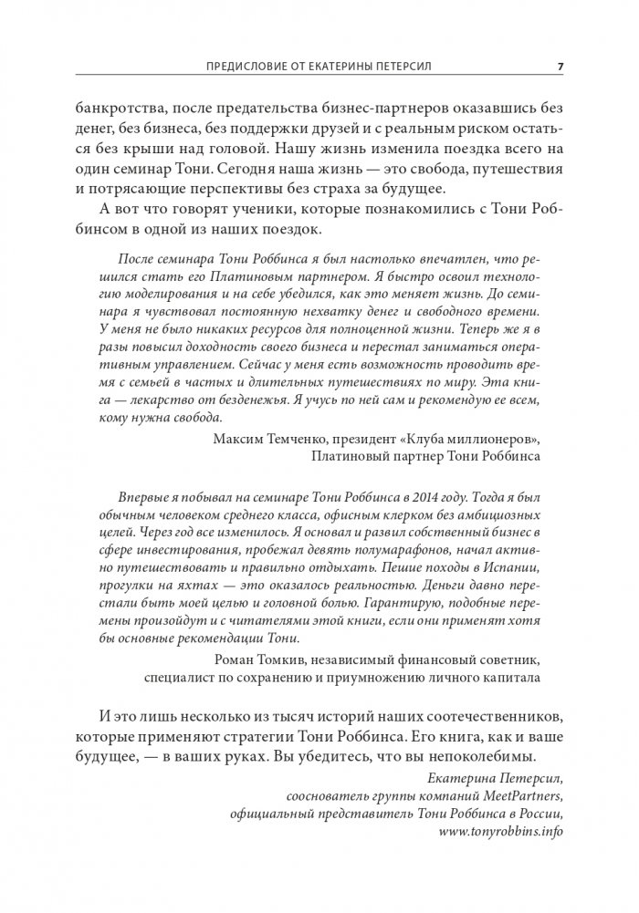Тони, через лекции и семинары которого прошло более 50 миллионов слушателей в 100 странах, считается первым стратегом бизнеса в мире. Эту книгу он написал в соавторстве с Питером Маллуком, единственным человеком в истории, которого журнал «Barron's» на протяжении трех лет подряд называл лучшим финансовым консультантом. Вместе они научат вас сохранять спокойствие и силу духа в нашем мире нестабильности, перемен и экономических потрясений и извлекать выгоду из страхов, которые парализуют многих людей.