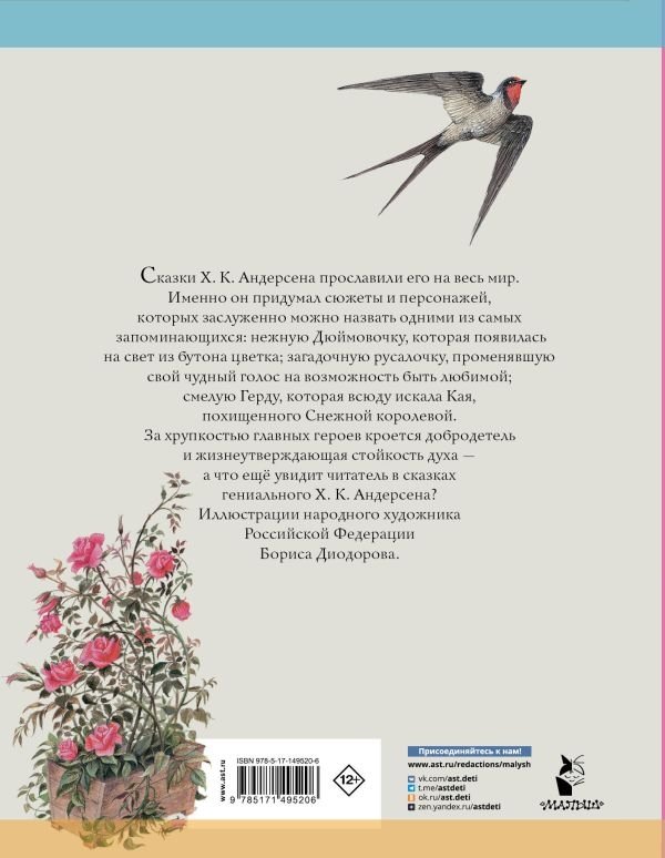 Сказки Х. К. Андерсена прославили его на весь мир. Именно он придумал сюжеты и персонажей, которых заслуженно можно назвать одними из самых запоминающихся: нежную Дюймовочку, которая появилась на свет из бутона цветка; загадочную русалочку, променявшую свой чудный голос на возможность быть любимой; смелую Герду, которая всюду искала Кая — мальчика, похищенного Снежной королевой. За хрупкостью главных героев кроется добродетель и жизнеутверждающая стойкость духа — а что ещё увидит читатель в сказках гениального Х. К. Андерсена?