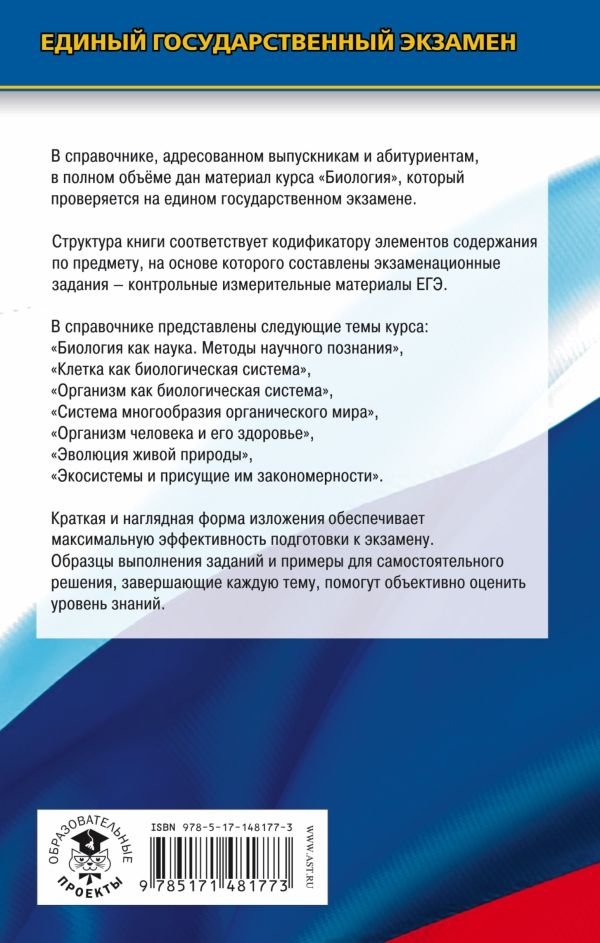 Данный справочник содержит весь теоретический материал по курсу биологии, необходимый для сдачи ЕГЭ. Он включает в себя все элементы содержания, проверяемые контрольно-измерительными материалами, и помогает обобщить и систематизировать знания и умения за курс средней (полной) школы.