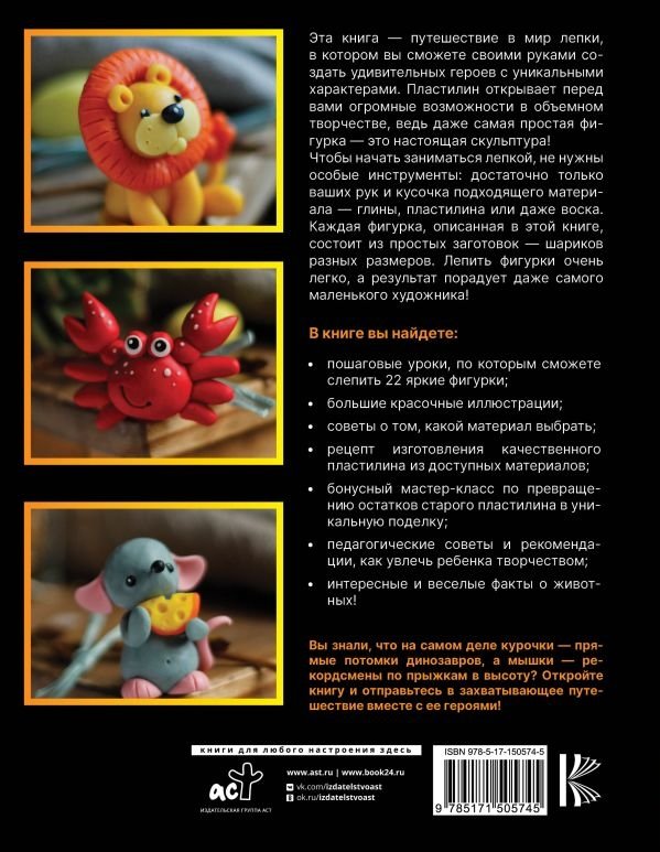 В книге собраны простые пошаговые инструкции по созданию множества фигурок. Чтобы начать заниматься лепкой, достаточно только рук и кусочка любого подходящего материала. Лепить фигурки очень просто, а результат порадет даже самого маленького художника!