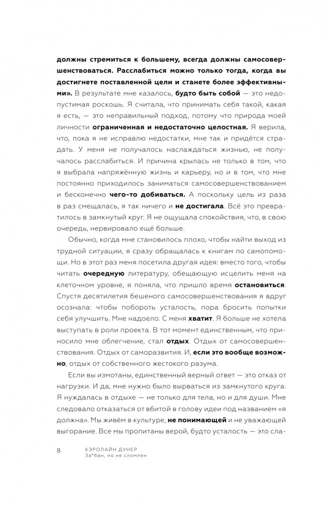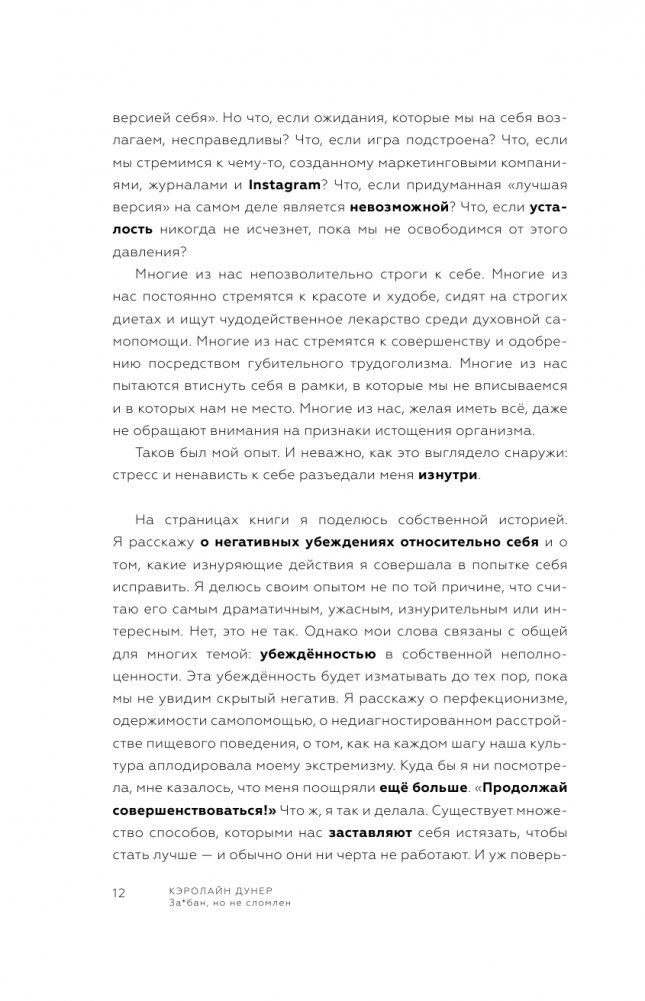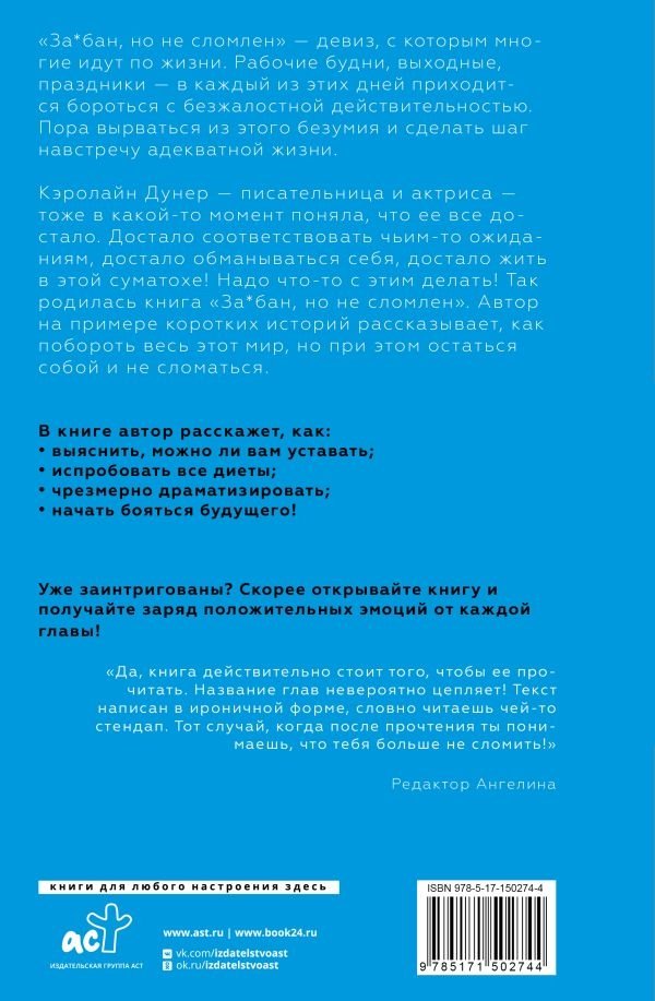 Кэролайн Дунер — писательница, актриса и певица — тоже в какой-то момент поняла, что ее все достало. Достало соответствовать чьим-то ожиданиям, достало обманывать себя, достало просто жить в этой суматохе! Надо что-то с этим делать! Так родилась книга "За*бан, но не сломлен. Как не сойти с ума". Автор на примере коротких историй рассказывает, как побороть весь этот мир, но при этом остаться собой и не сломаться.