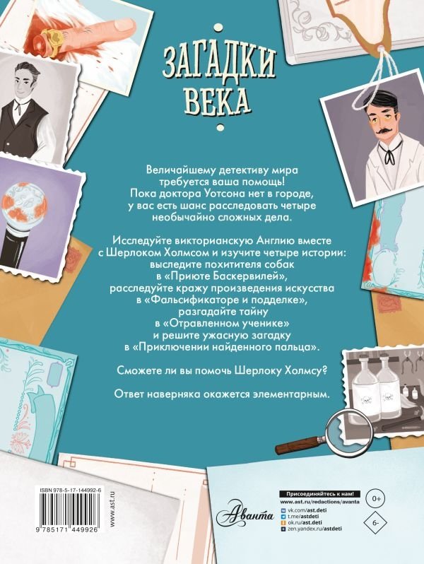 "Загадки века. Шерлок Холмс ведёт расследование" — великолепная книга-игра, в которой читателю предстоит примерить на себя роль помощника самого знаменитого сыщика всех времён, Шерлока Холмса. Четыре загадочных и громких дела позволят с головой погрузиться в детективный мир. По мере прохождения каждой истории читатель будет изучать улики, газетные статьи, всевозможные записки и письма, а в конце, сложив все полученные данные, сможет вынести вердикт и раскрыть дело.