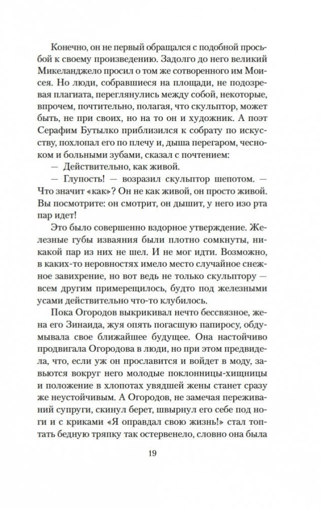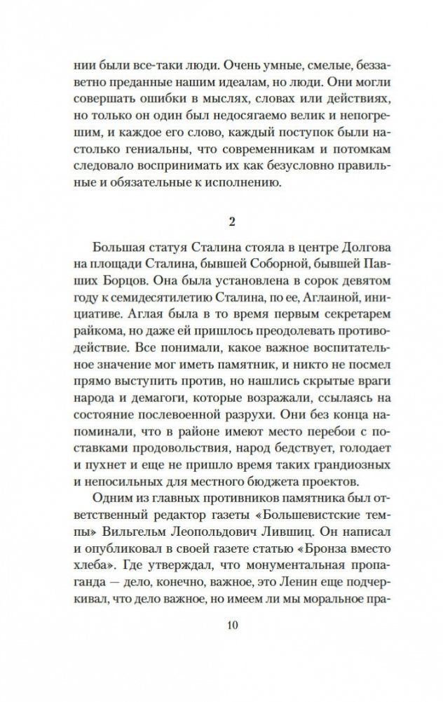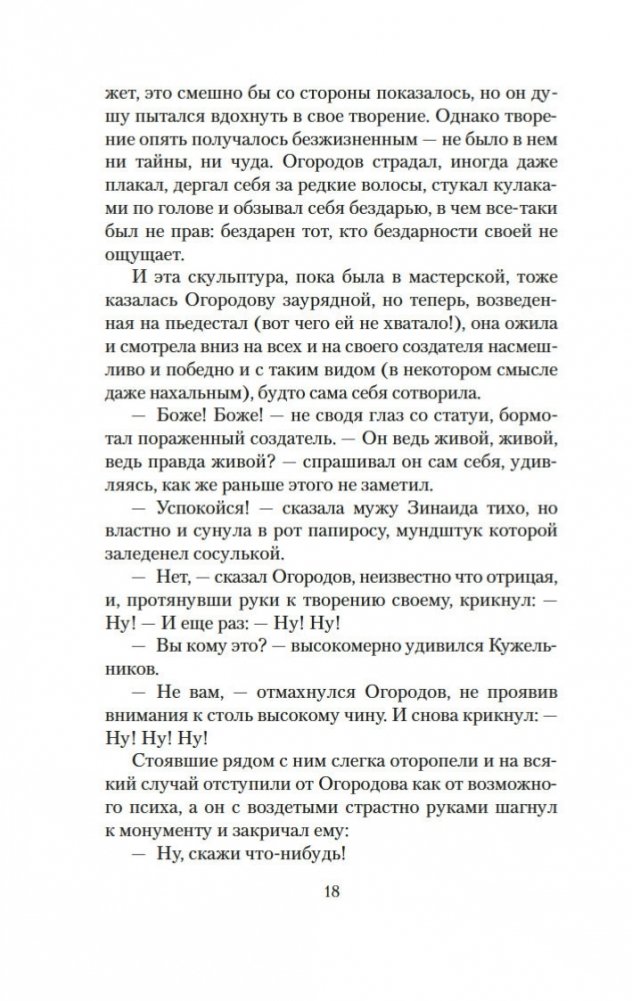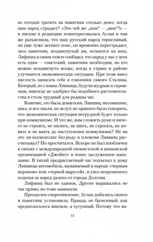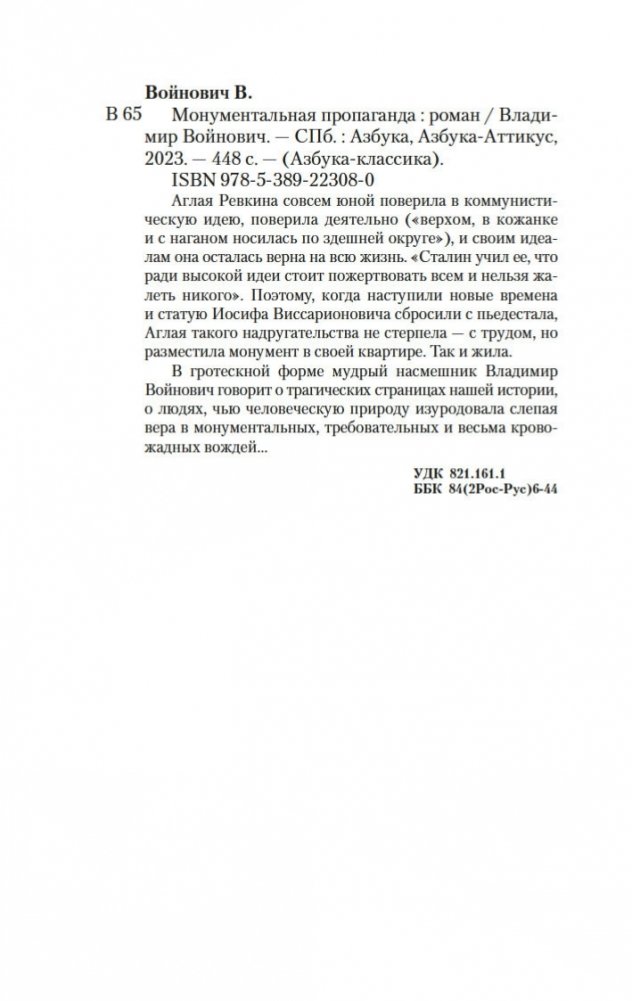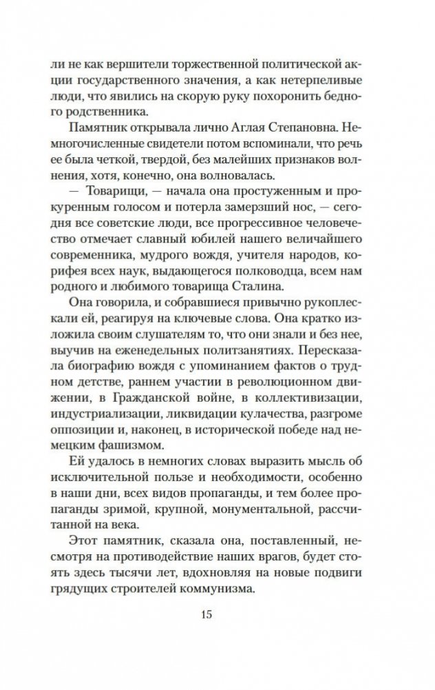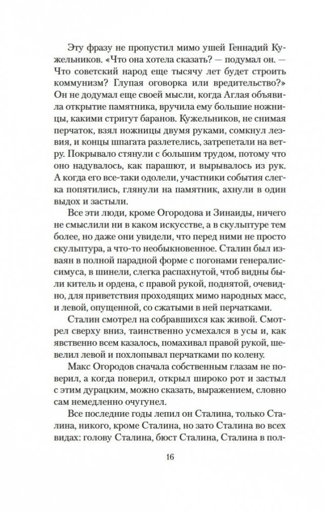 Аглая Ревкина совсем юной поверила в коммунистическую идею, поверила деятельно («верхом, в кожанке и с наганом носилась по здешней округе»), и своим идеалам она осталась верна на всю жизнь. «Сталин учил ее, что ради высокой идеи стоит пожертвовать всем и нельзя жалеть никого». Поэтому, когда наступили новые времена и статую Иосифа Виссарионовича сбросили с пьедестала, Аглая такого надругательства не стерпела — с трудом, но разместила монумент в своей квартире. Так и жила. В гротескной форме мудрый насмешник Владимир Войнович говорит о трагических страницах нашей истории, о людях, чью человеческую природу изуродовала слепая вера в монументальных, требовательных и весьма кровожадных вождей...