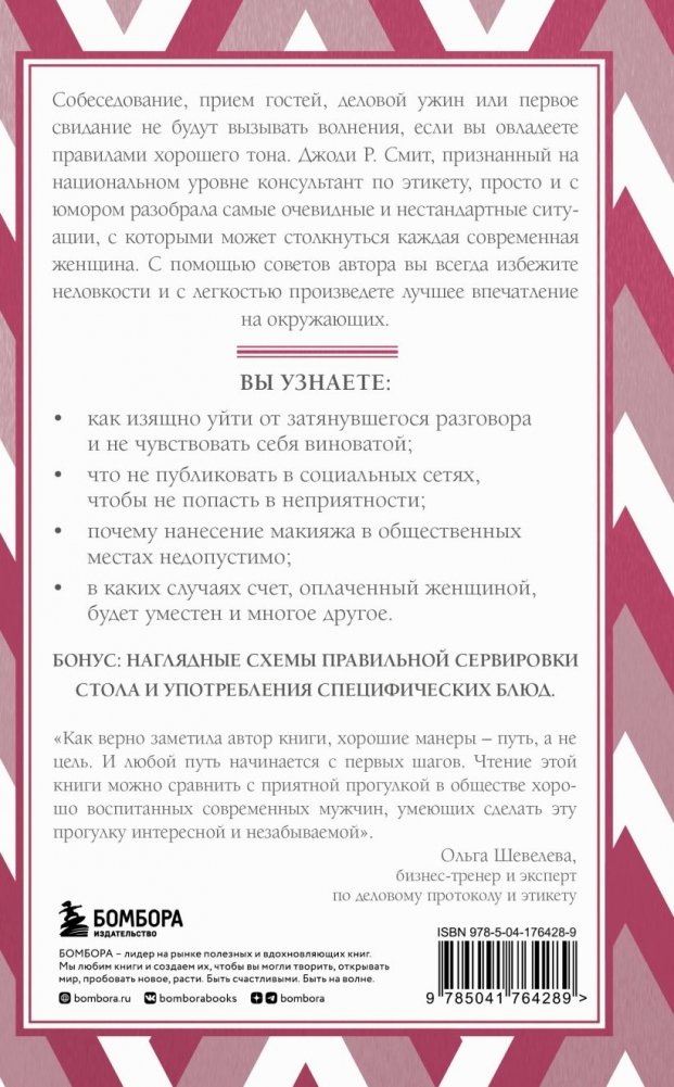 Собеседование, прием гостей, деловой ужин или первое свидание не будут вызывать волнения, если вы овладеете правилами хороших тона. Джоди Р. Смит, признанный на национальном уровне консультант по этикету, просто и с юмором разобрала самые очевидные и нестандартные ситуации, с которыми может столкнуться каждая современная женщина. С помощью советов автора вы всегда избежите неловкости и с легкостью произведете лучшее впечатление на окружающих.