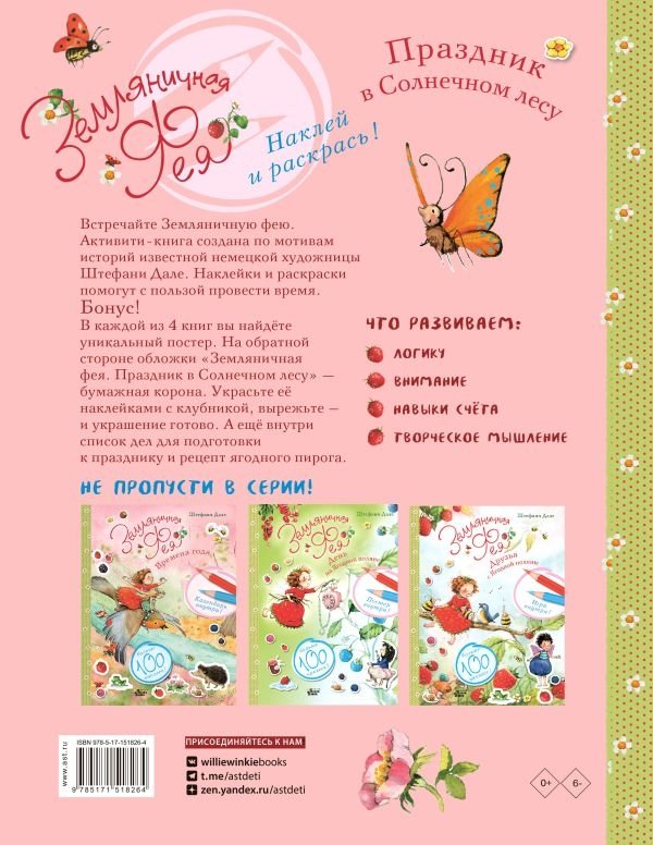 Раскраски и наклейки с популярным персонажем из серии книг о Земляничной фее увлекут ребенка. Бонус! В каждой из 4 книг вы найдете уникальный постер. На обратной стороне обложки «Земляничная фея. Праздник в Солнечном лесу» бумажная корона. Украсьте ее наклейками с клубникой, вырежьте — и украшение готово. А еще внутри список дел для подготовки к празднику и рецепт ягодного пирога.