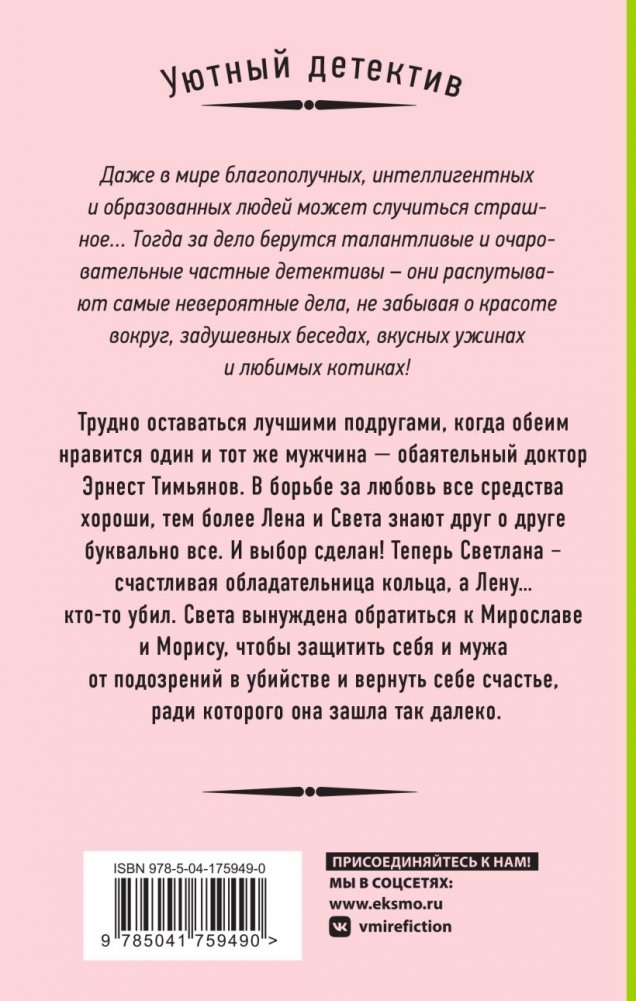 Трудно оставаться лучшими подругами, когда обеим нравится один и тот же мужчина — обаятельный доктор Эрнест Тимьянов. В борьбе за любовь все средства хороши, тем более Лена и Света знают друг о друге буквально все. И выбор сделан! Теперь Светлана — счастливая обладательница кольца, а Лену… кто-то убил. Света вынуждена обратиться к Мирославе и Морису, чтобы защитить себя и мужа от подозрений в убийстве и вернуть себе счастье, ради которого она зашла так далеко.