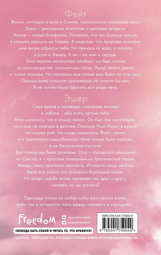 Днем — рекламное агентство и деловые встречи. Ночью — новый бойфренд. Понимая, что так больше нельзя, я решила рвануть на Гавайи. В надежде, что природа поможет мне вновь обрести себя. Но прячась от всех, я попала в руки к Эшеру. А он — ко мне в сердце. Этот парень напоминал айсберг: он был соткан из противоречий, не заметных глазу. Эшер любил океан и тушил пожары. Но затушить мое пламя ему было не под силу. Однако даже сильное притяжение не спасло бы нас. Я не готова была бросить все ради него.
