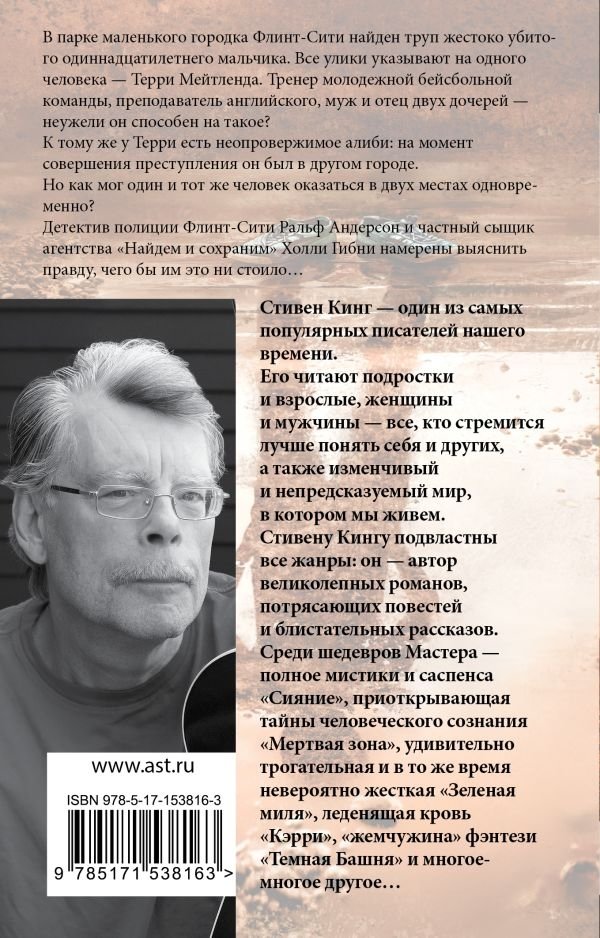 В парке маленького городка Флинт-Сити найден труп жестоко убитого одиннадцатилетнего мальчика. Все улики указывают на одного человека — Терри Мейтленда. Тренер молодежной бейсбольной команды, преподаватель английского, муж и отец двух дочерей — неужели он способен на такое? К тому же у Терри есть неопровержимое алиби: на момент совершения преступления он был в другом городе.